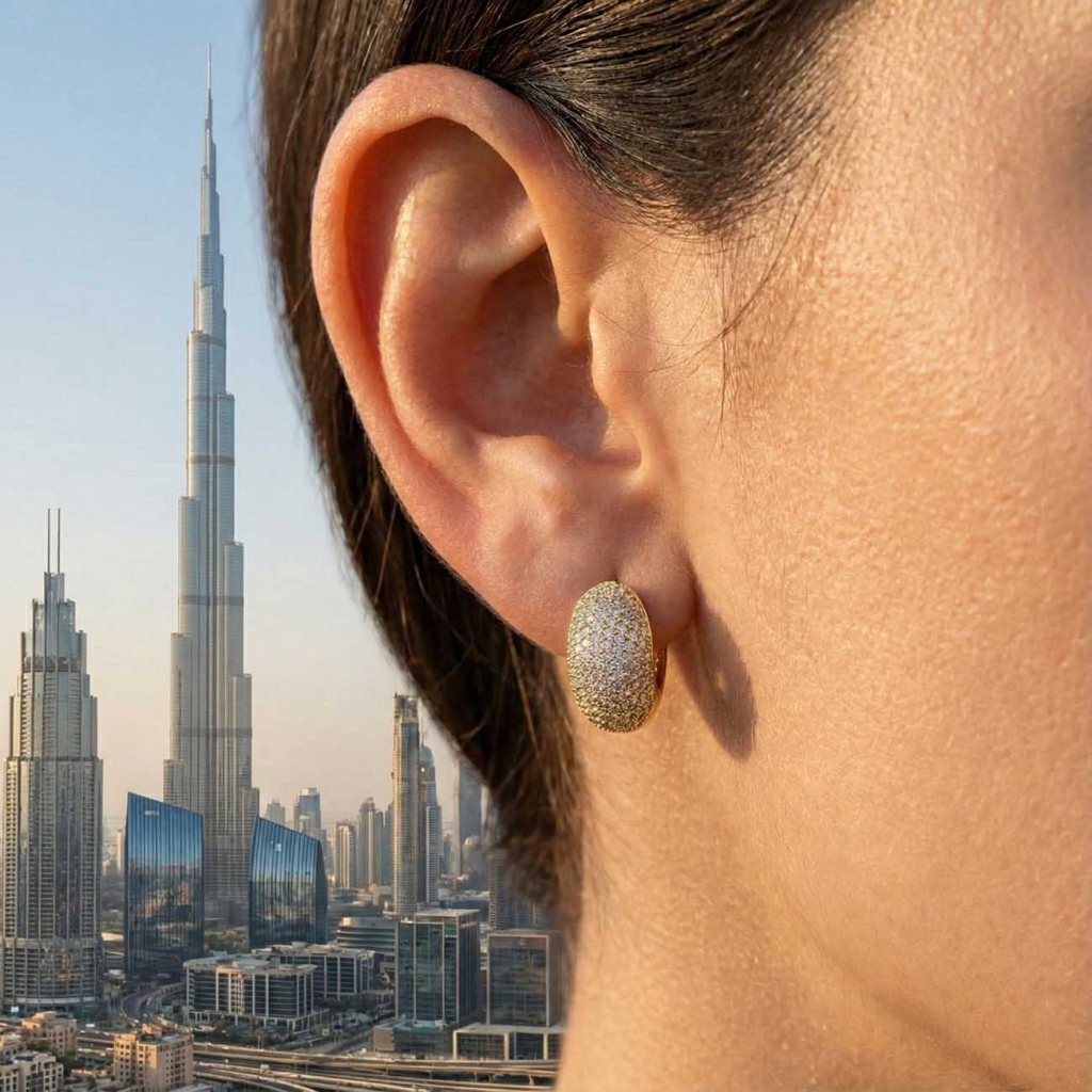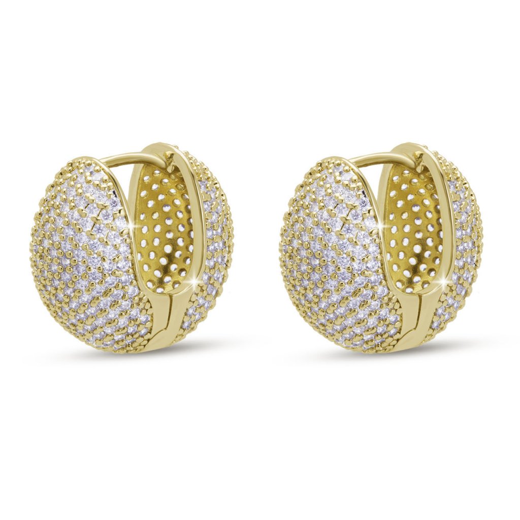 Cercei de efect placați cu aur de 14K, împodobiți bogat cu zirconii, emană lux și eleganță.