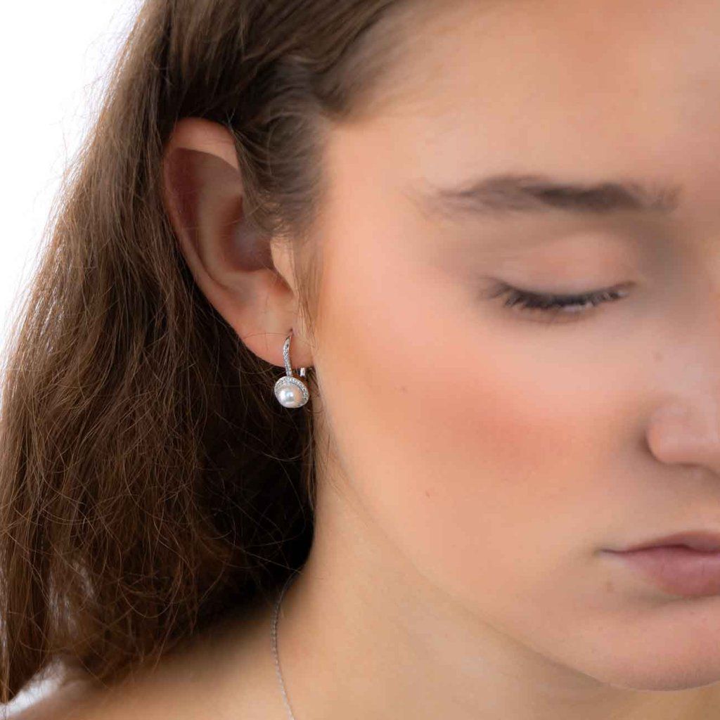Cercei eleganți, decorați cu o perlă centrală și încadrați de zirconii mici și clare. Un design clasic și atemporal, care subliniază feminitatea și stilul – ideal pentru ocazii festive și ținute de zi cu zi.