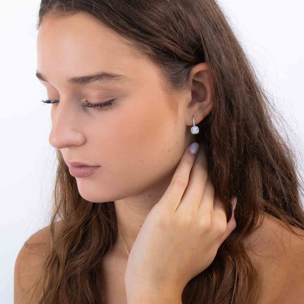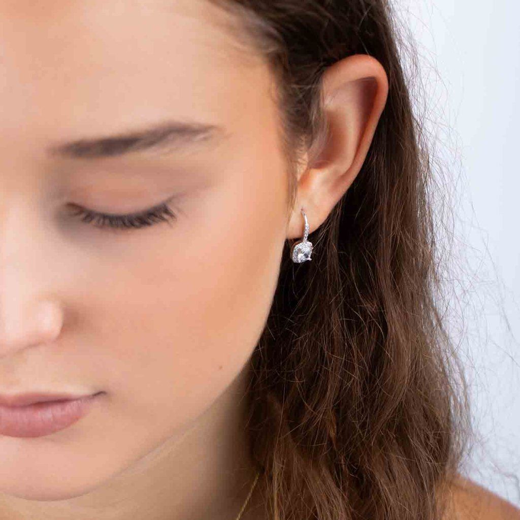 Cercei eleganți, suspendați, cu un zirconiu cubic central transparent, cu tăietură pătrată și margine cu pietre mici. Manoperă precisă și design clasic, potrivite atât pentru o ocazie festivă, cât și pentru o ținută de seară.
