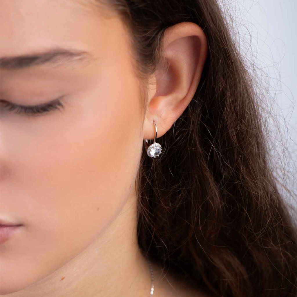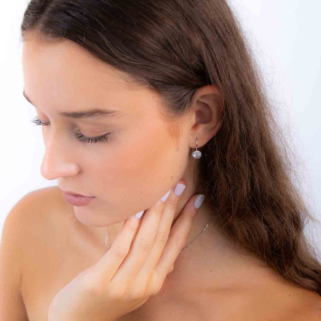 Cercei strălucitori cu zirconiu cubic rotund și clar în partea centrală, mărginiți de pietre mici. Design clasic cu închidere franțuzească, care va adăuga eleganță oricărei ținute – de la o zi obișnuită până la un eveniment festiv.