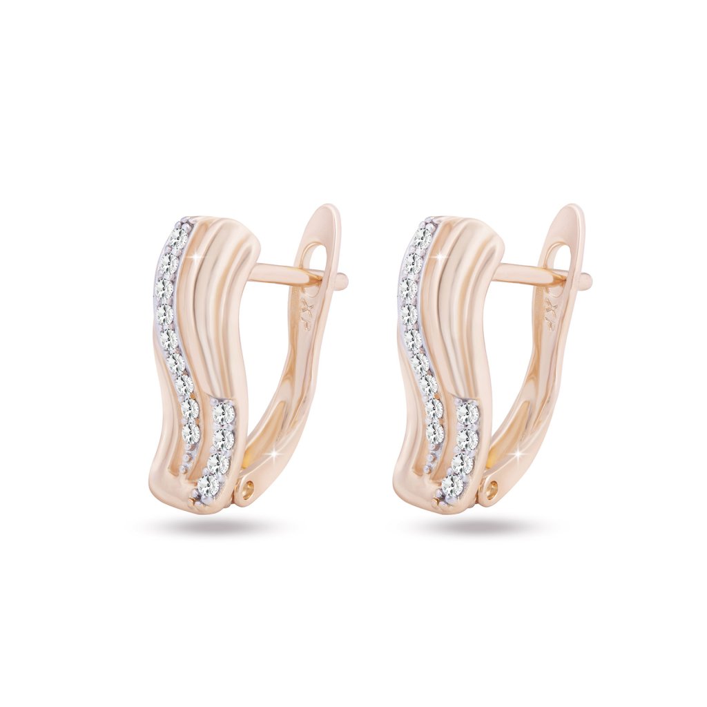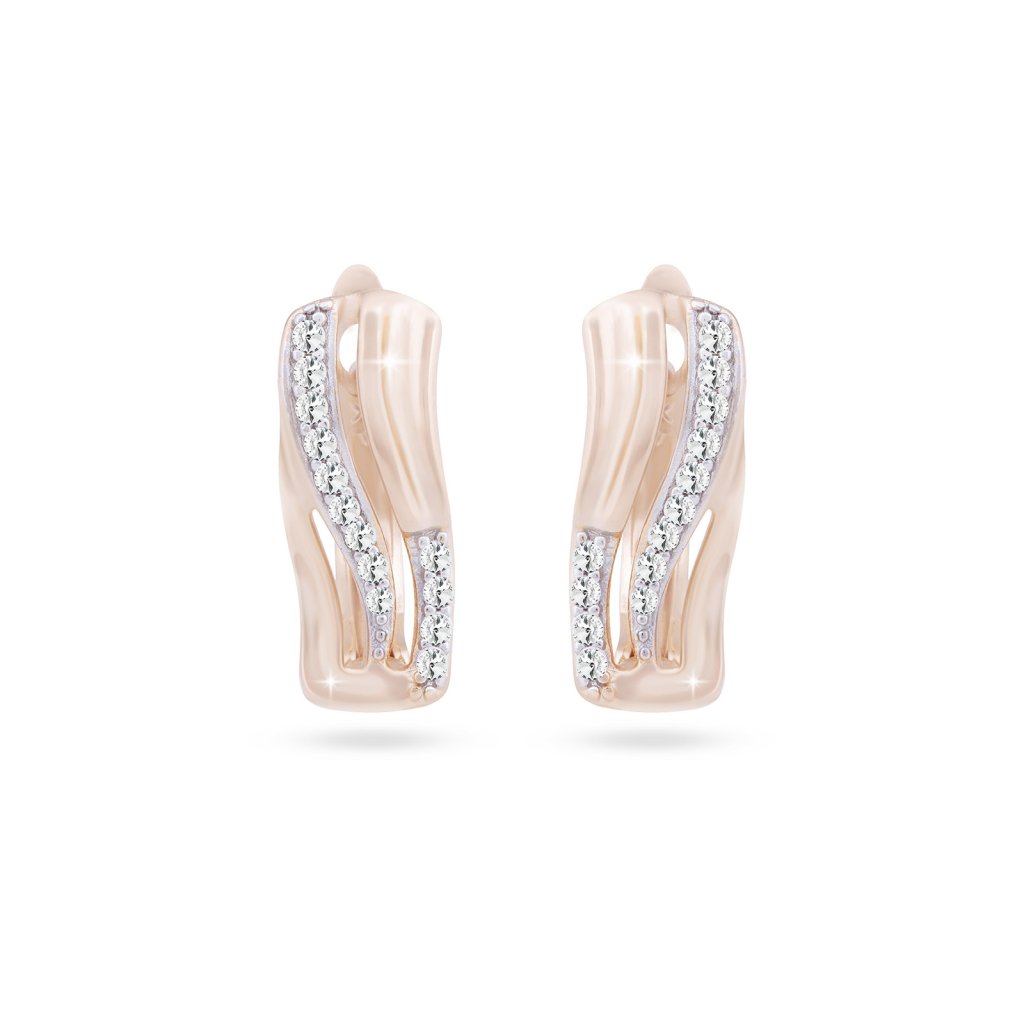 Designul ondulat al acestor cercei eleganți este evidențiat de două curbe de zirconiu transparent, care adaugă o strălucire delicată întregii bijuterii. Suprafața este finisată cu un strat lucios de aur roz, care asigură un aspect romantic și un contrast impresionant cu pietrele. Potrivit pentru purtarea de zi cu zi, precum și pentru ocazii festive. Închiderea practică de tip clapeta (închidere rusească) garantează o purtare confortabilă și sigură.