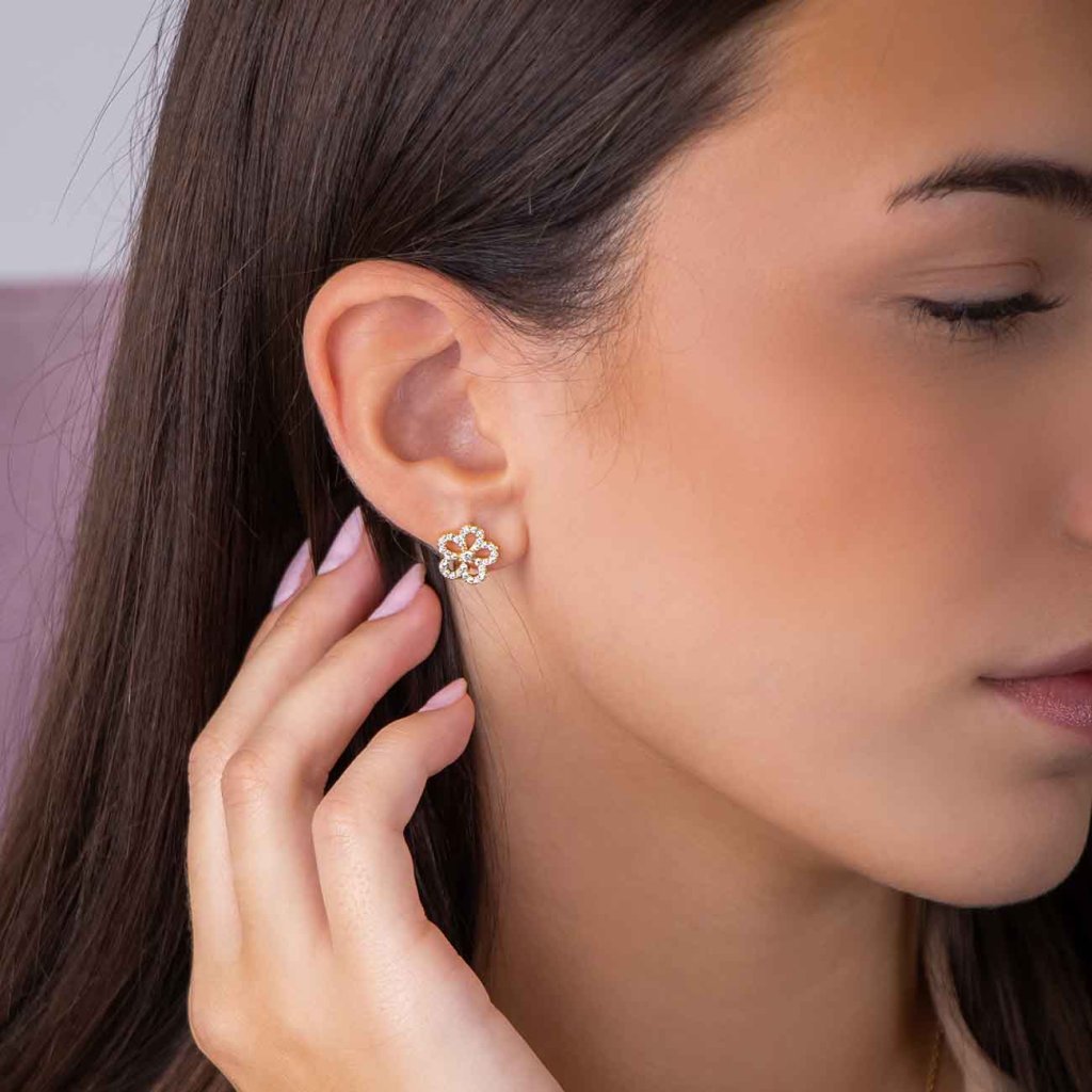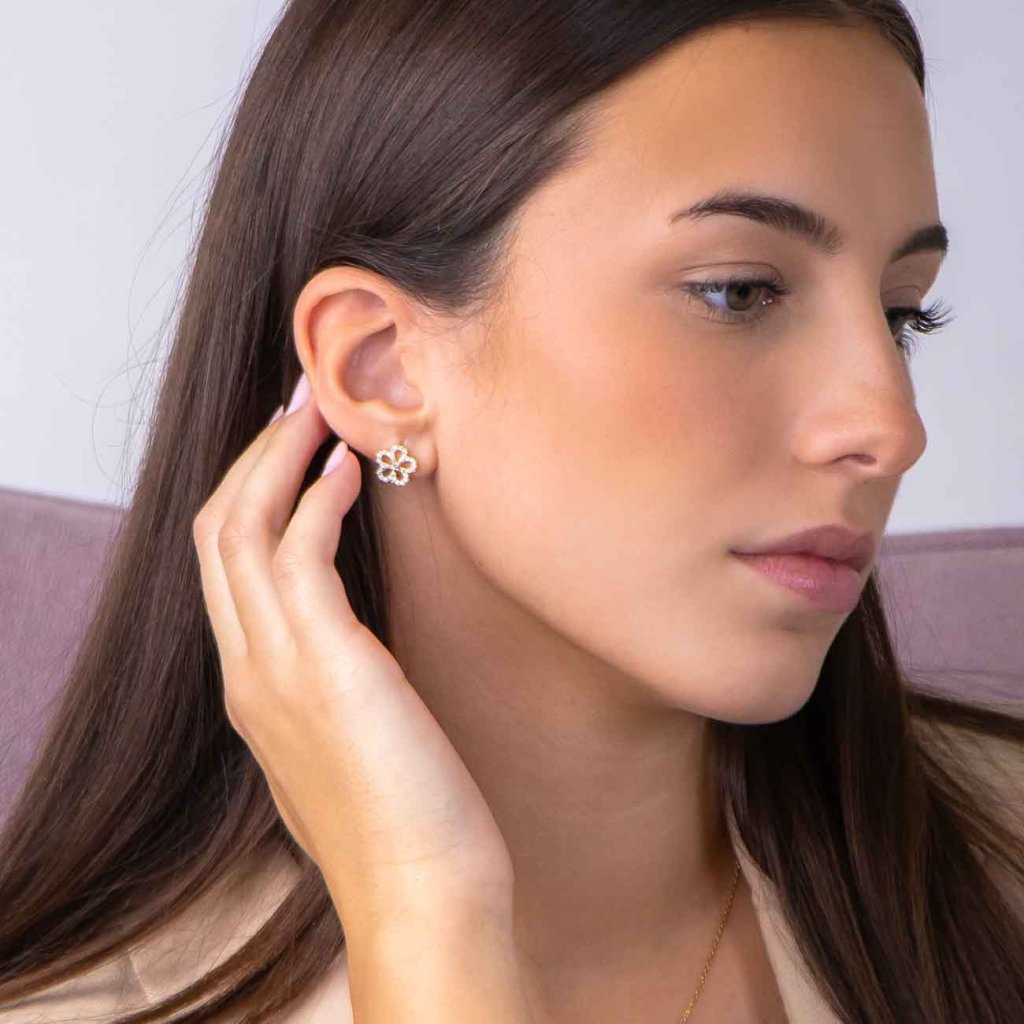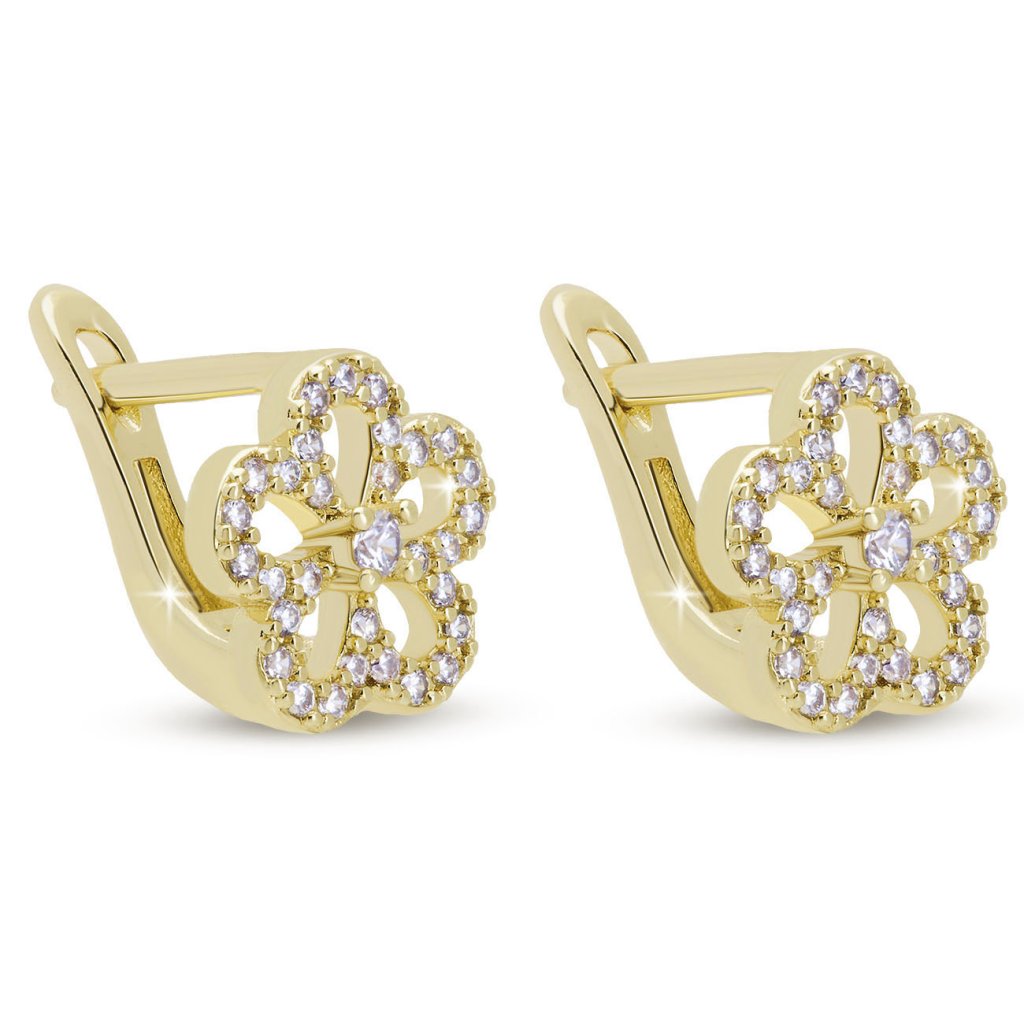 Eleganță discretă într-un design floral. Acești cercei sunt decorați cu zirconii clare delicate, încrustate într-un contur placat cu aur în formă de floare. Completează perfect atât o ținută festivă, cât și un stil de zi cu zi. Închiderea practică asigură o purtare confortabilă și sigură.