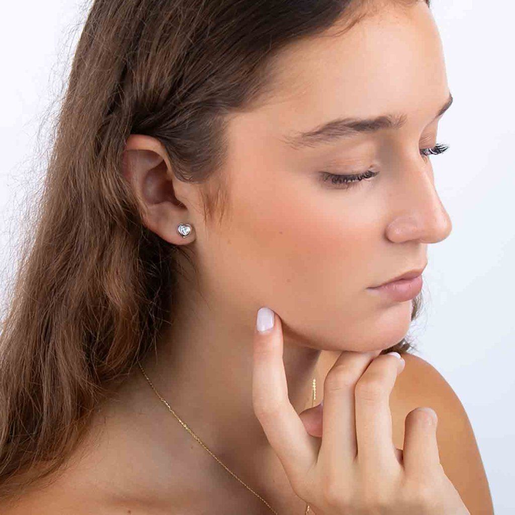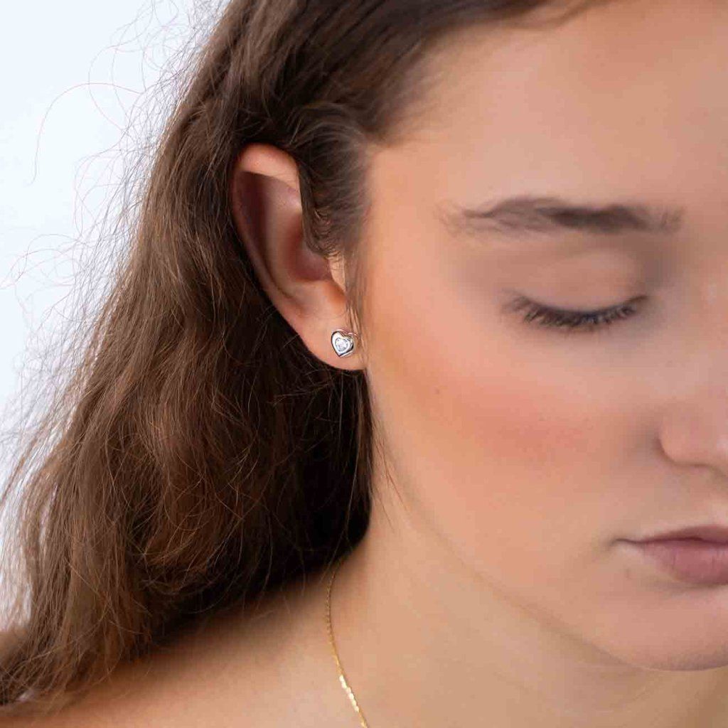 Cercei de damă din argint - inimi cu un zirconiu cubic, care este, de asemenea, în formă de inimă.