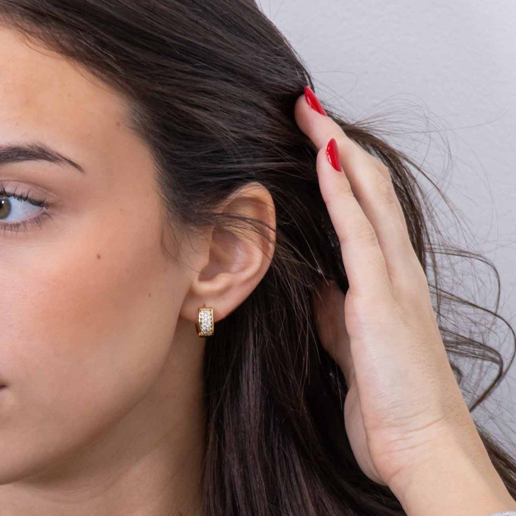 Cerceluri rotunde de lux cu zirconii transparente strălucitoare, așezate în trei rânduri, oferă strălucire maximă și un stil elegant. Partea din spate precisă, cu grilaj, le conferă un detaliu rafinat. O alegere excelentă pentru evenimente festive și ținute de seară.