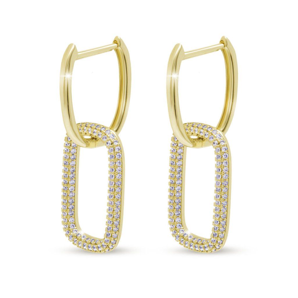 Cercei moderni cu un design geometric delicat vor impresiona prin strălucirea și forma lor. Două părți interconectate – partea superioară netedă și cea inferioară proeminentă în formă de „O” oval, împodobită cu zirconii transparente – formează un întreg armonios. Vor completa perfect atât ținuta de zi cu zi, cât și cea festivă. Sistemul de închidere este asigurat de o clapetă practică (închidere rusească).