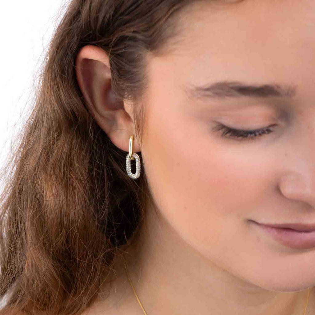 Cercei de damă din argint placat cu aur - oval cu zirconiu cubic.