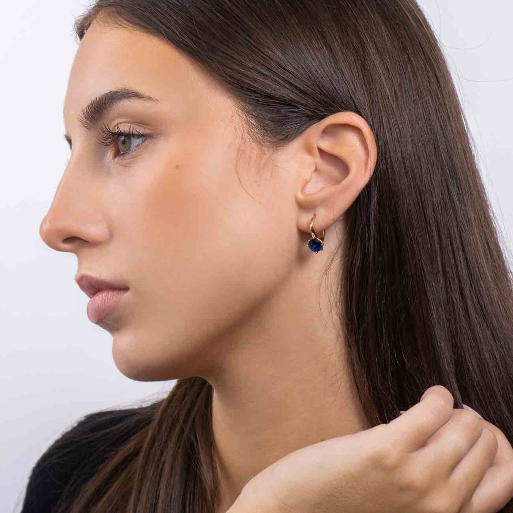 Cerceii delicați cu zirconiu albastru închis vor adăuga o notă de noblețe și gust rafinat oricărei ținute. Designul elegant, cu suprafață placată cu aur, în combinație cu forma clasică și piatra strălucitoare, creează o impresie decentă, dar totuși fermecătoare.