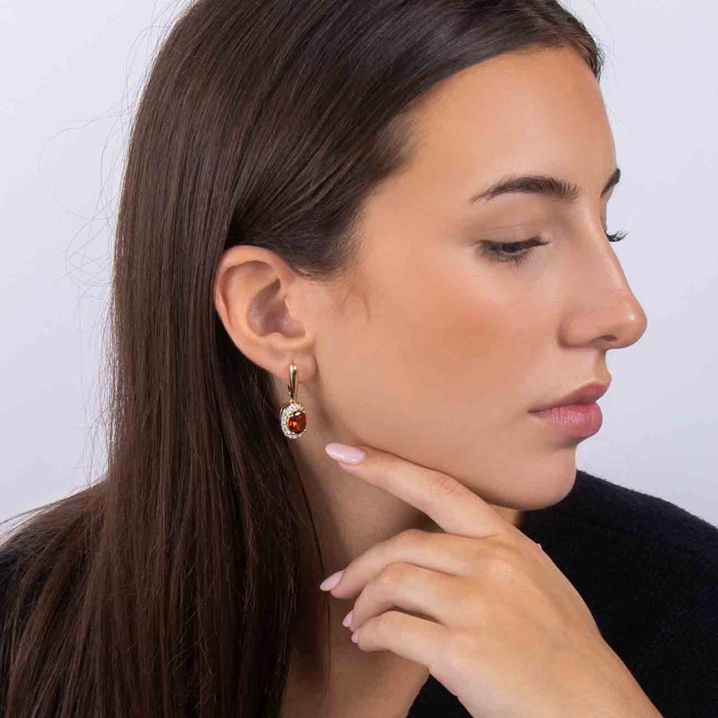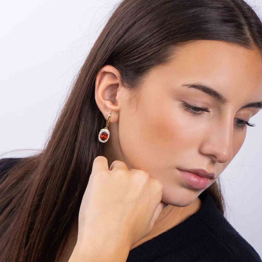 Designul distinct combină noblețea și delicatețea – cristalul central oval, într-o nuanță profundă de roșu, este așezat cu sensibilitate într-un halo de zirconiu, care reflectă lumina la fiecare mișcare. Luciul auriu conferă bijuteriei o notă de lux, care rămâne, în același timp, elegantă și discretă. O alegere ideală pentru momentele de seară, dar și ca accesoriu elegant pentru ținuta de zi.