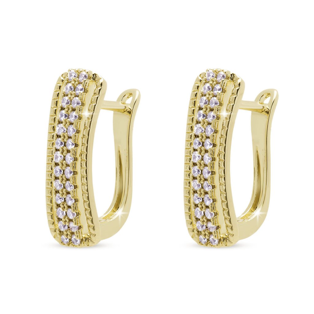 Oferă-i ținutei tale un detaliu strălucitor cu acești cercei eleganți, cu design vertical, în tonuri aurii. Linia dublă de zirconii clare oferă cerceilor o strălucire luxoasă, în timp ce gravura fină de pe laterale adaugă un plus de rafinament. Accesoriul ideal pentru rochii de seară, dar și pentru ținutele de zi cu zi.
