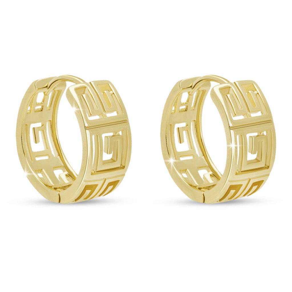 Design care poartă simbolistica frumuseții antice și a stilului atemporal. Acești cercei rotunzi placați cu aur, cu motivul cheii grecești, arată spectaculos, dar rămân eleganți și universali. Accesoriul perfect pentru o ținută minimalistă, precum și pentru a evidenția un look de seară.