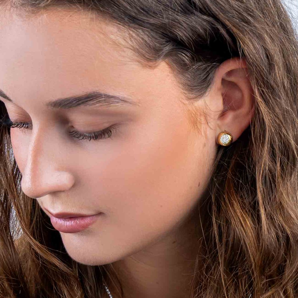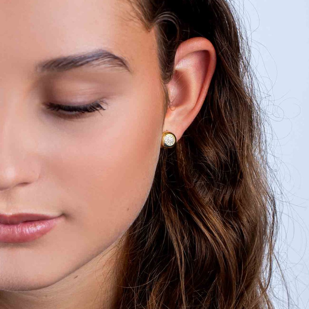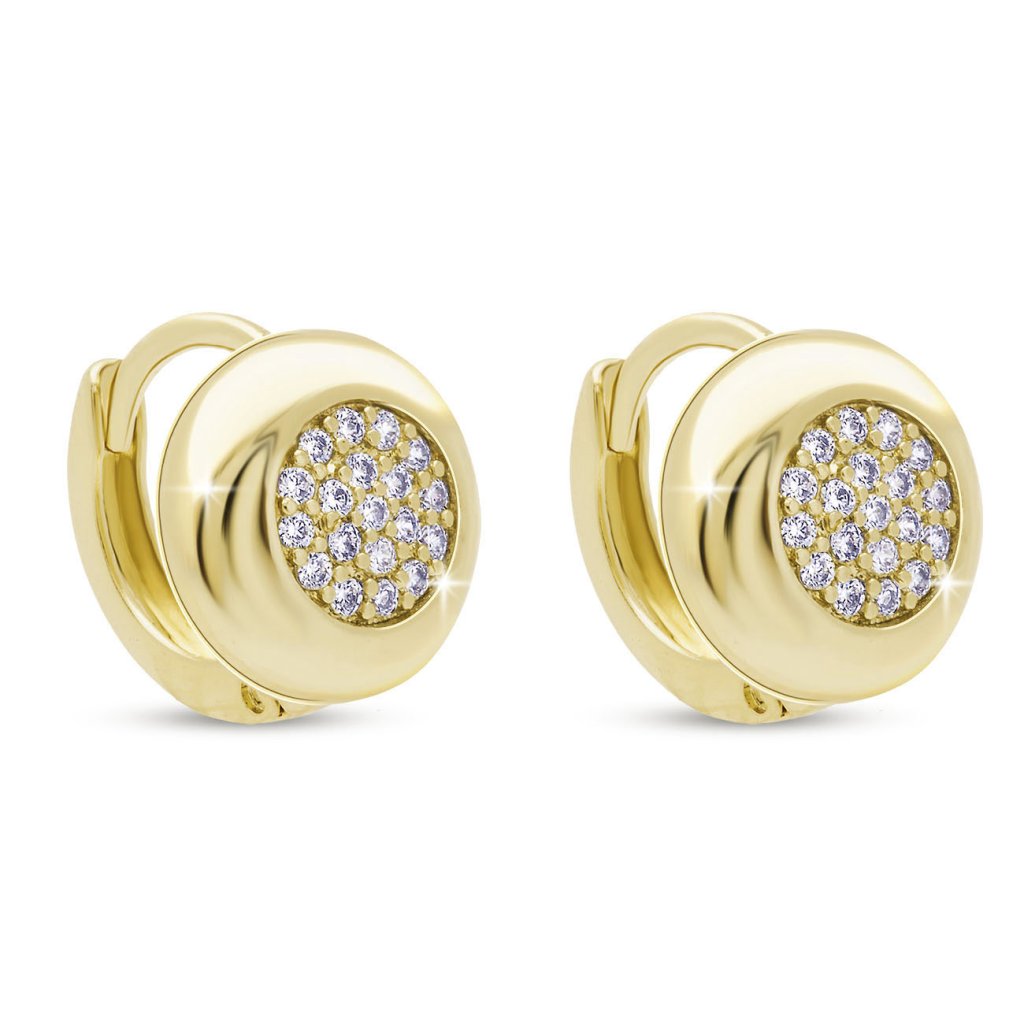 Cercei eleganți, de formă rotundă, cu un ornament central din zirconii clare. Suprafața cerceilor este tratată cu rodiu, ceea ce le conferă strălucire, rezistență la zgârieturi și un aspect luxos, cu o tentă argintie.