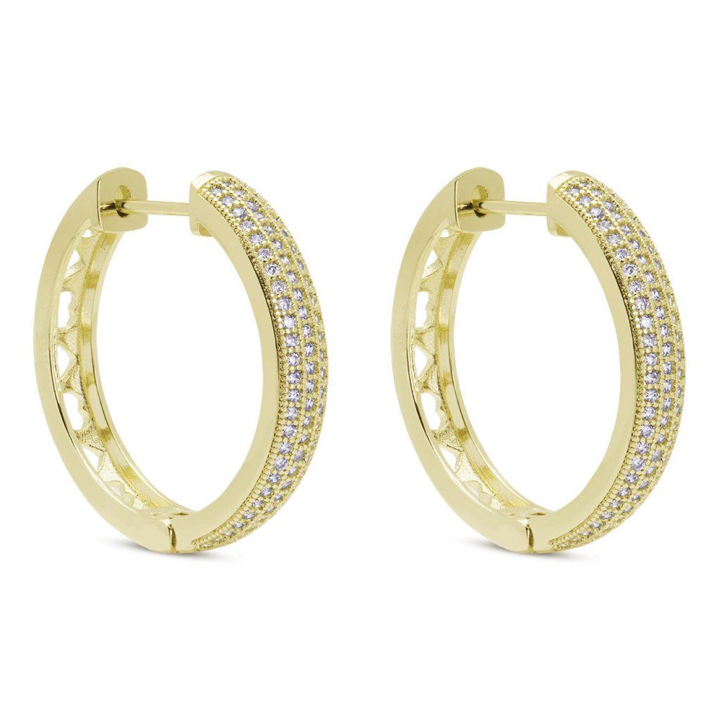 Adaugă un accent radiant și atemporal aspectului tău. Acești cercei rotunzi, prelucrați cu precizie, cu zirconii strălucitoare, arată elegant și impunător în același timp. Un detaliu fin sub formă de tăieturi de inimă pe partea din spate adaugă o notă unică și romantică bijuteriei.