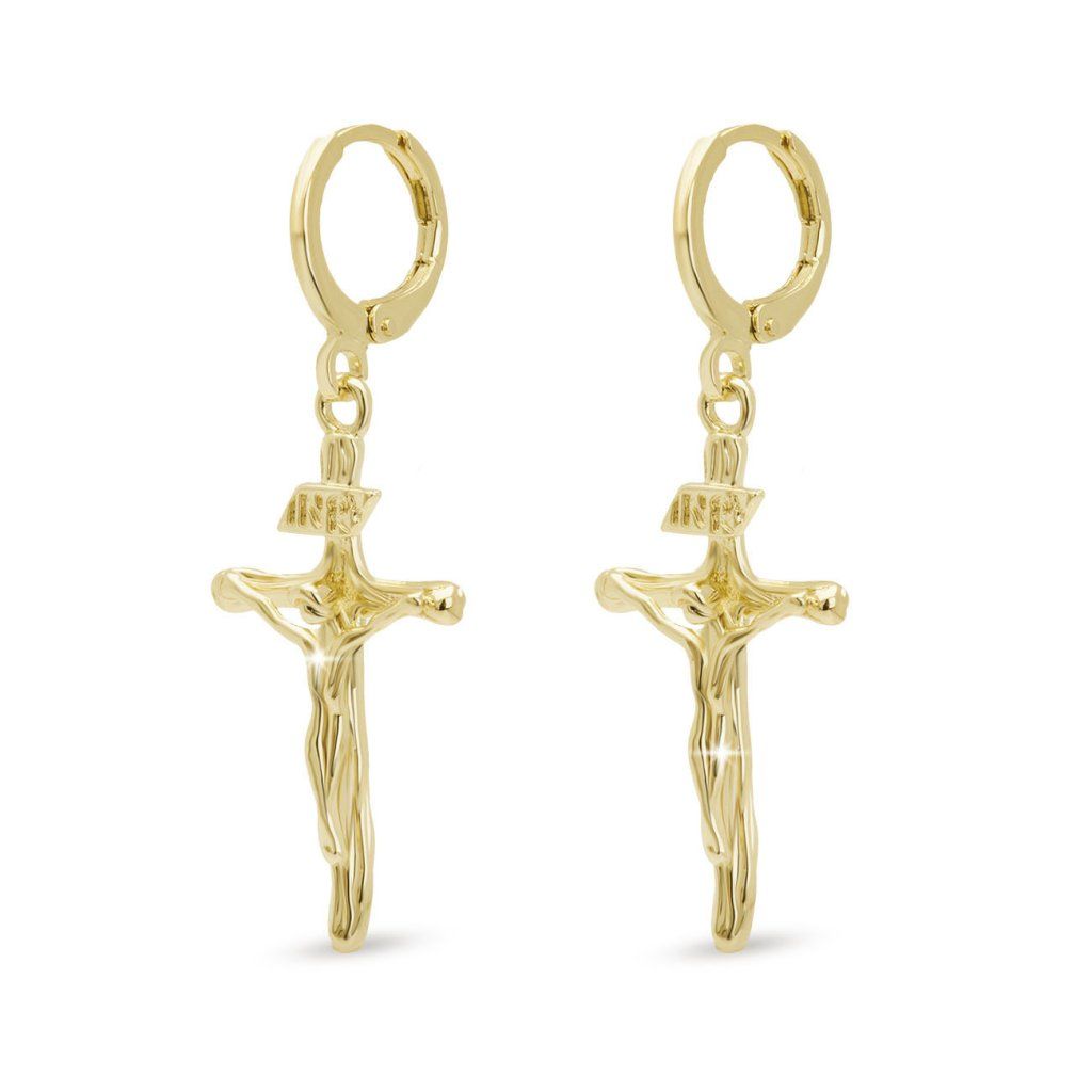 Îmbunătățiți-vă stilul cu acești uimitori cercei placați cu aur cu un motiv în cruce cu Hristos ! Cercei simpli și frumoși cu o închidere clasică, realizați din metal placat cu rodiu și lustruiți la perfecțiune, rămân ferm fixați, fiind în același timp antialergici pentru confort de lungă durată. Adăugați o notă elegantă oricărei ținute și purtați această bijuterie la modă pe tot parcursul zilei!