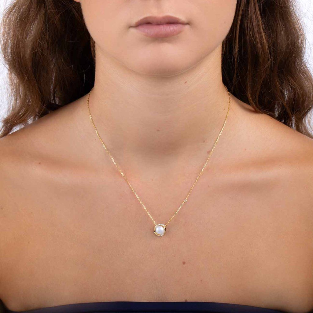 Un colier elegant din argint veritabil Ag 925/1000, placat cu aur de 14k, îmbină frumusețea perlei cu strălucirea zirconiilor clare într-o formă armonioasă rotundă. Un detaliu decent pe lanț adaugă finețe și originalitate întregii bijuterii. Un accesoriu stilat pentru eleganța de zi cu zi și momente speciale.