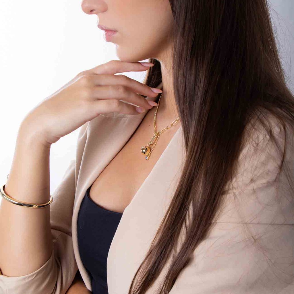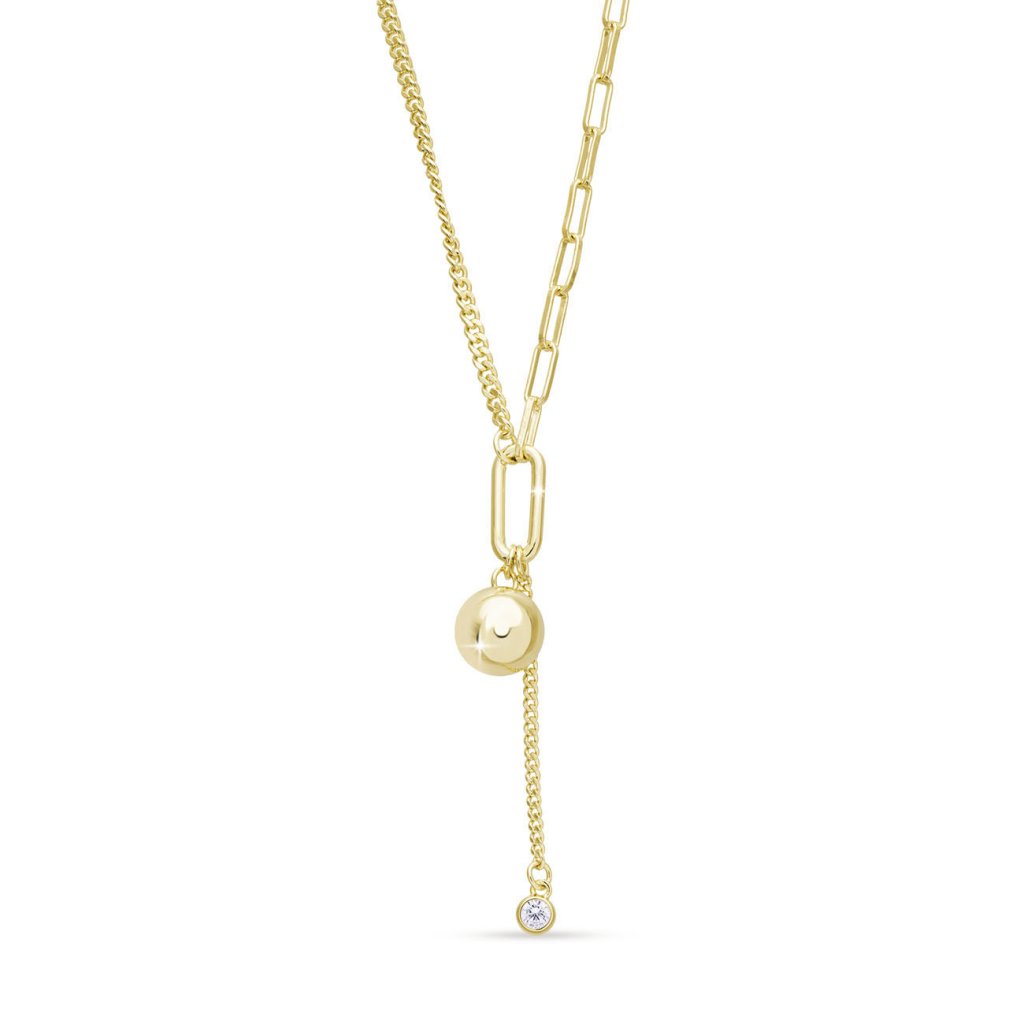 Colierul modern cu finisaj auriu se remarcă prin designul său asimetric, o combinație de două tipuri de zale și un pandantiv distinctiv. Un detaliu frumos este zirconiul lucios agățat de un lanț subțire, care adaugă bijuteriei finețe și feminitate. Completează perfect o ținută minimalistă, precum și stratificarea cu alte coliere.