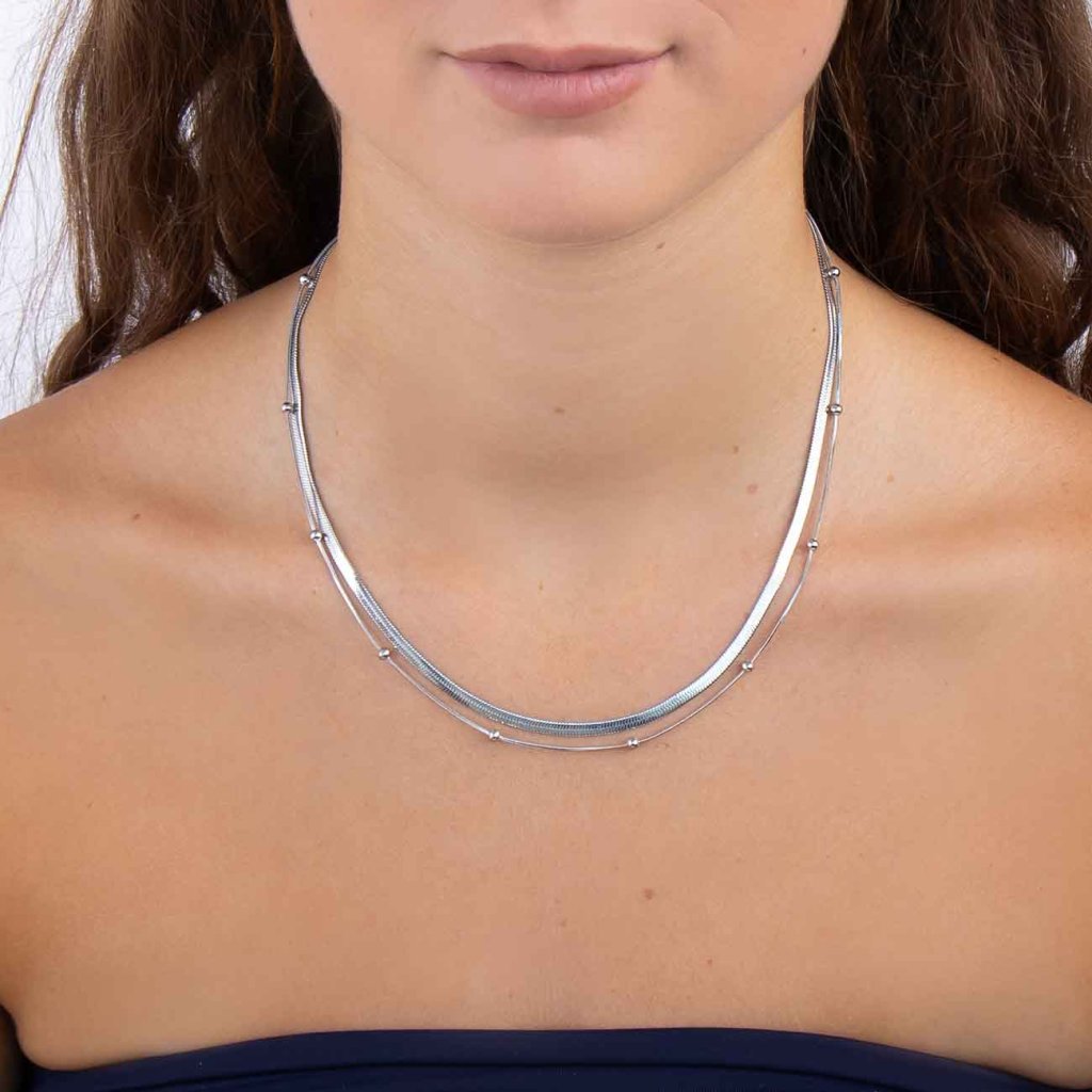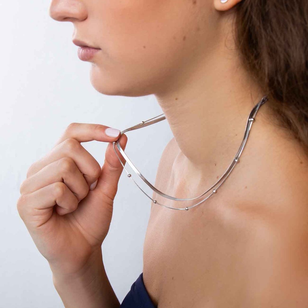Acest colier cu două rânduri din oțel chirurgical atrage atenția prin prelucrarea sa precisă și designul atemporal. Două lanțuri de lungimi diferite creează un efect stratificat delicat, care arată elegant și interesant. Fiecare lanț este decorat cu bile metalice netede, care adaugă o notă modernă bijuteriei.