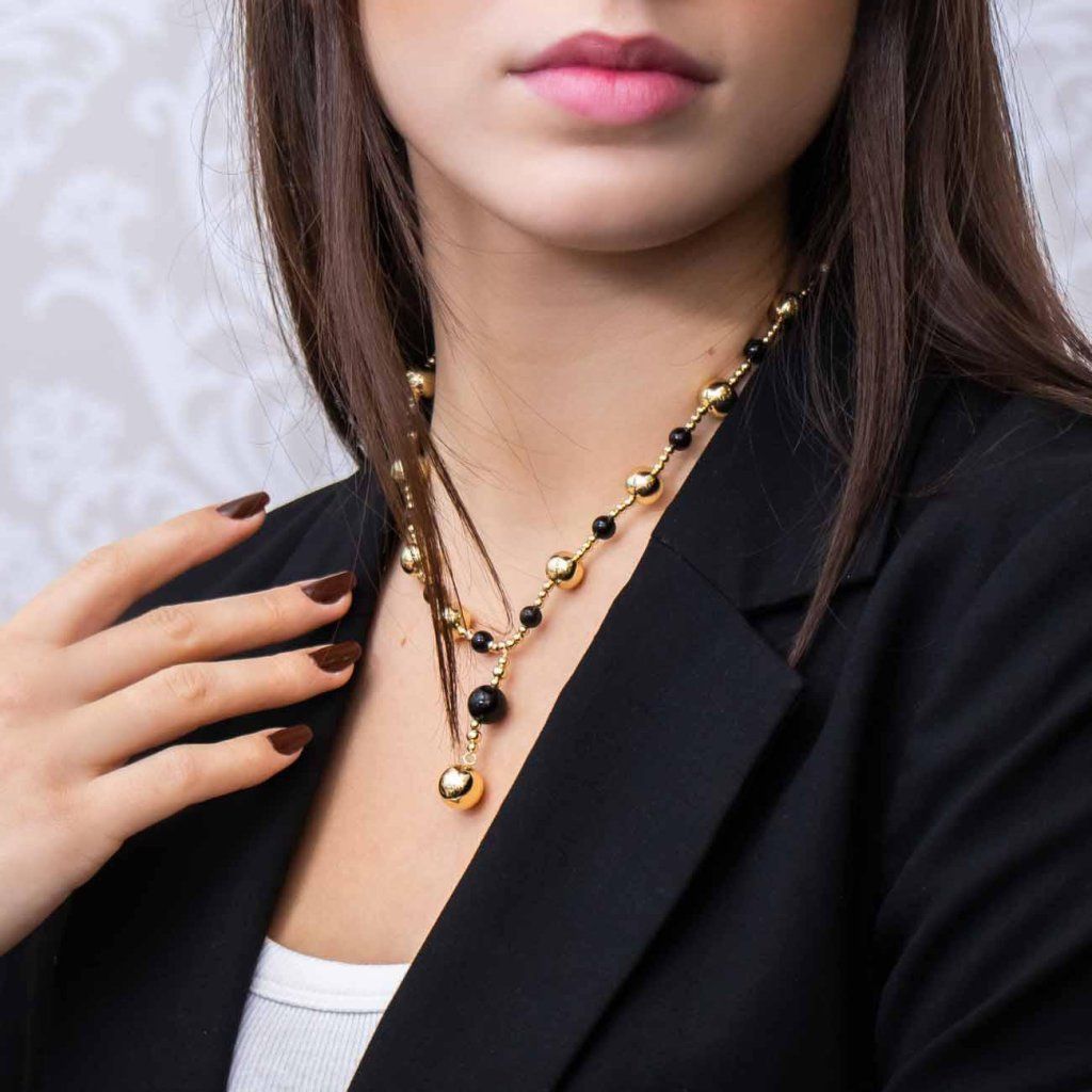 Colierul discret, dar inconfundabil, impresionează prin compoziția elaborată de mărgele aurii strălucitoare și mărgele negre, care creează împreună un contrast sofisticat. Partea suspendată conferă bijuteriei lejeritate și prelungește optic linia decolteului. Colierul este alegerea ideală pentru a fi purtat zilnic, dar și ca un accesoriu stilat pentru o ținută elegantă.