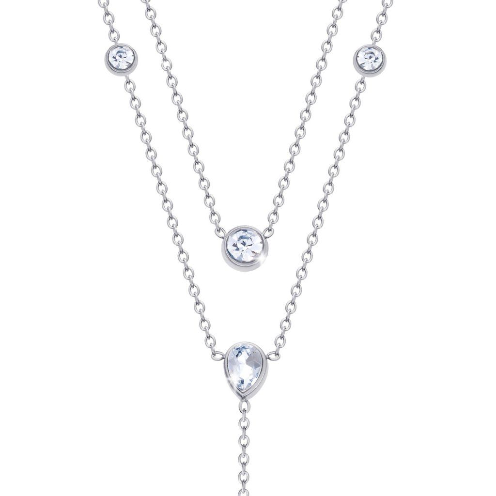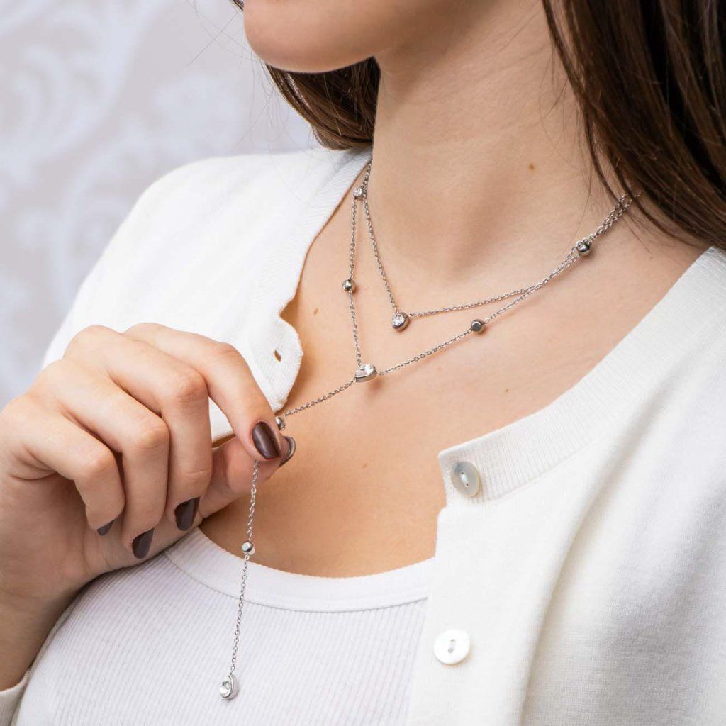 Colier rafinat multi-șir cu design stratificat, care conferă un aspect lejer, sofisticat și foarte feminin. Colierul superior este decorat cu mici detalii rotunde din zirconiu, în timp ce linia inferioară este finisată cu o picătură delicată, care prelungește natural silueta și adaugă un accent elegant bijuteriei.