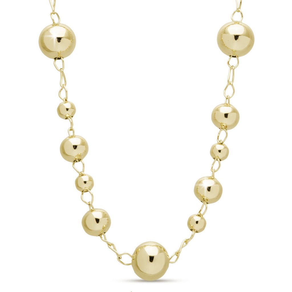 Un ritm de bile lucioase de diferite dimensiuni. Suprafață netedă, luciu auriu, construcție ușoară. Un accesoriu distinctiv pentru un stil modern și clasic.