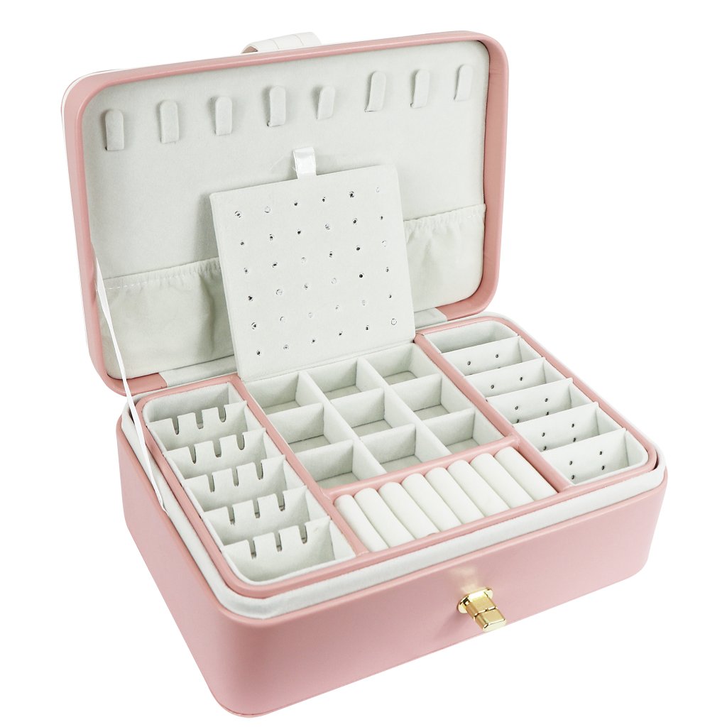 Această cutie de bijuterii cu două niveluri vă permite să depozitați în mod convenabil și sigur diferite tipuri de inele, lanțuri, brățări, broșe și alte accesorii.
