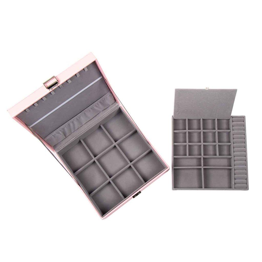 În interior se află un material moale din piele întoarsăcare protejează bijuteriile de zgârieturi. Cutia de bijuterii oferă două niveluri spațioase, oferind un spațiu de depozitare cu adevărat generos. Vei găsi compartimente mari și mai mici, role pentru inele, locuri pentru cercei și spațiu pentru lanțuri sau alte accesorii. Datorită inserției portabile și diviziunii inteligente, amenajarea interioară poate fi ușor personalizată.