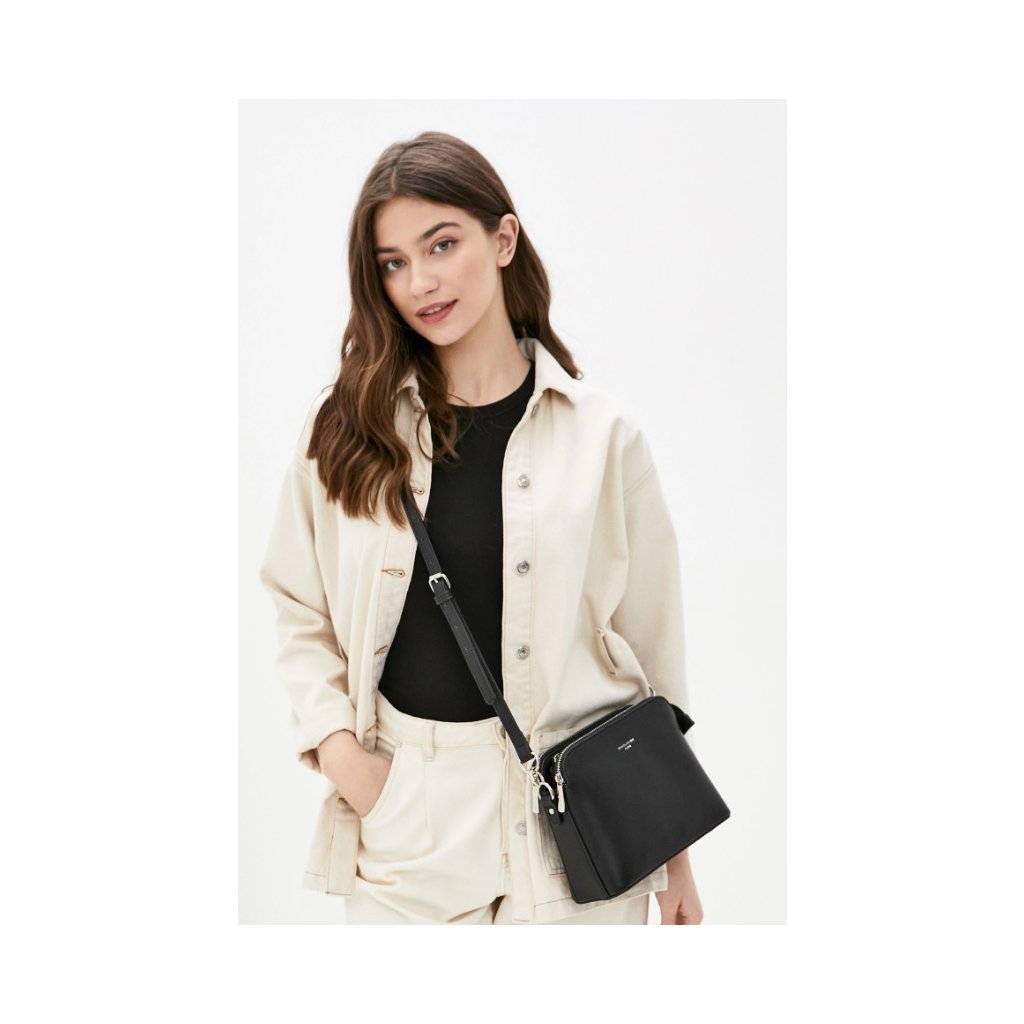 - Formă dreptunghiulară cu colțuri rotunjite. Panoul frontal este decorat cu un logo subtil David Jones. Geanta are trei compartimente cu închidere cu fermoar. În interiorul compartimentului din mijloc veți găsi 2 buzunare mai mici pentru telefon și obiecte mici.