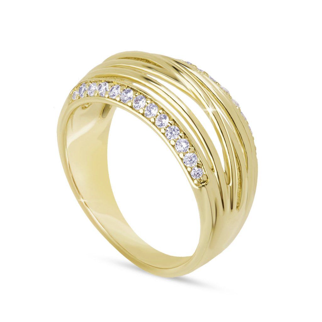 Acest inel elegant impresionează prin designul său neconvențional, care combină linii fine cu pietre strălucitoare. Liniile inelului amintesc de benzi ușor ondulate, între care sunt așezate două rânduri de zirconii rotunde mici, care creează o strălucire impresionantă la fiecare mișcare a mâinii.