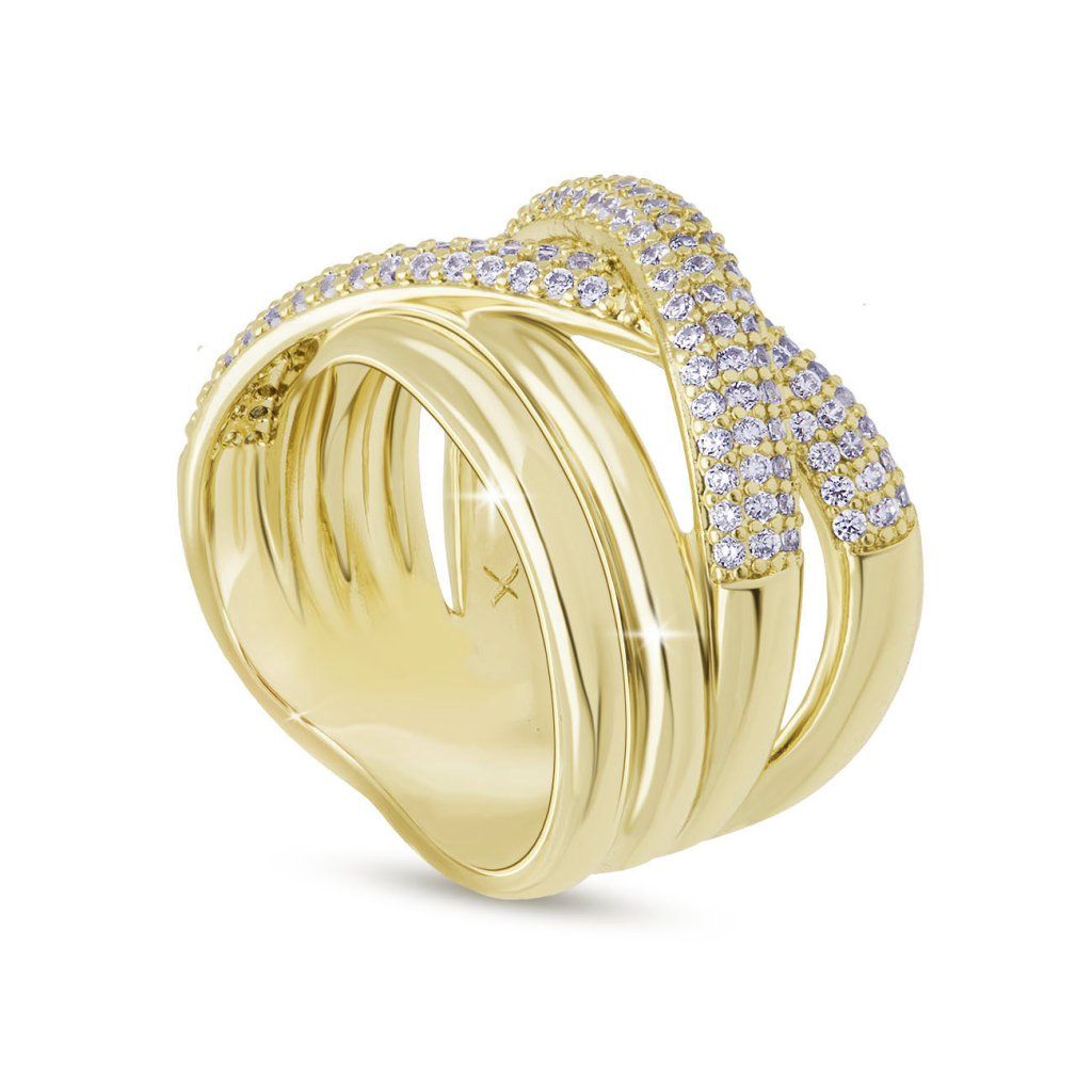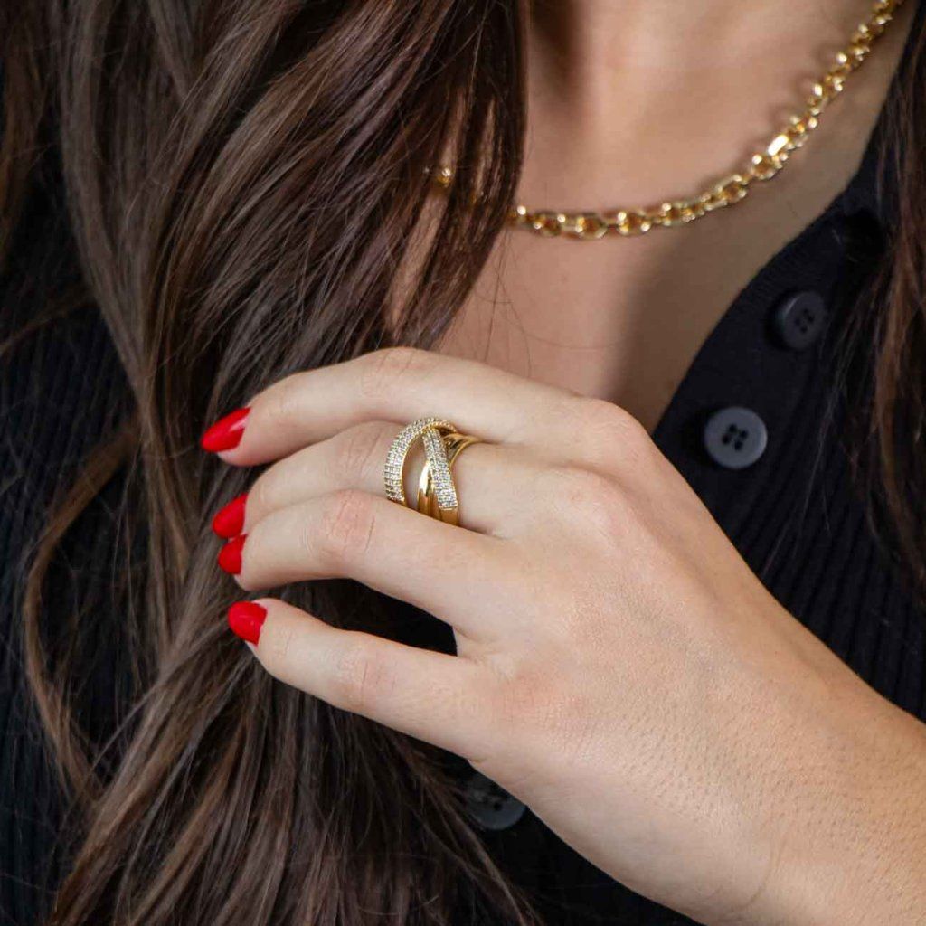 Un inel atemporal cu linii încrucișate combină metalul lucios și curele bogat decorate cu zirconiu. Designul spectaculos atrage atenția și conferă fiecărei ținute o notă de eleganță.