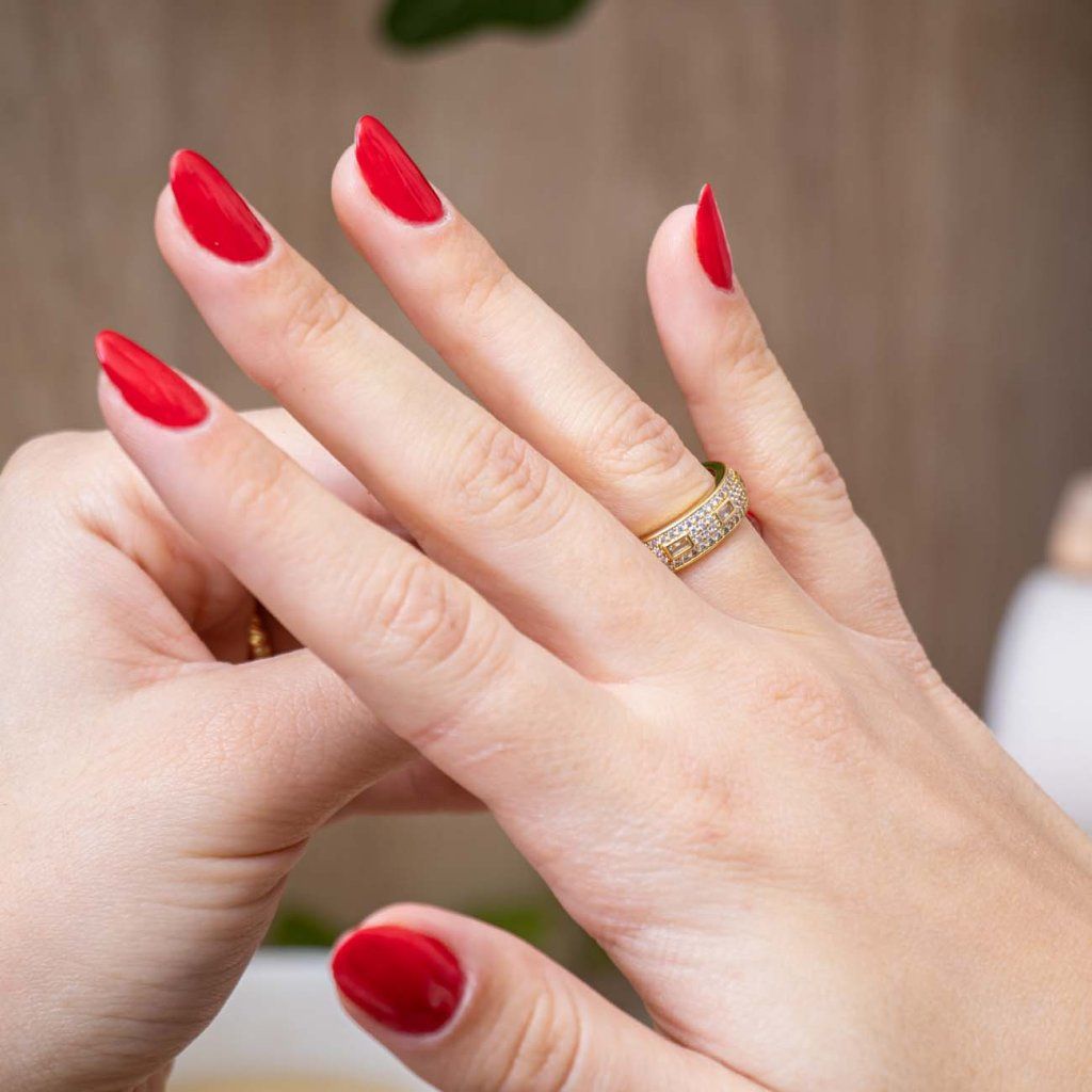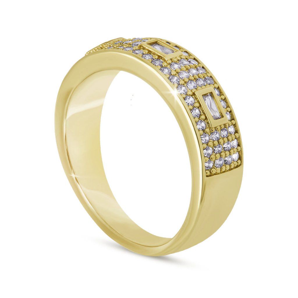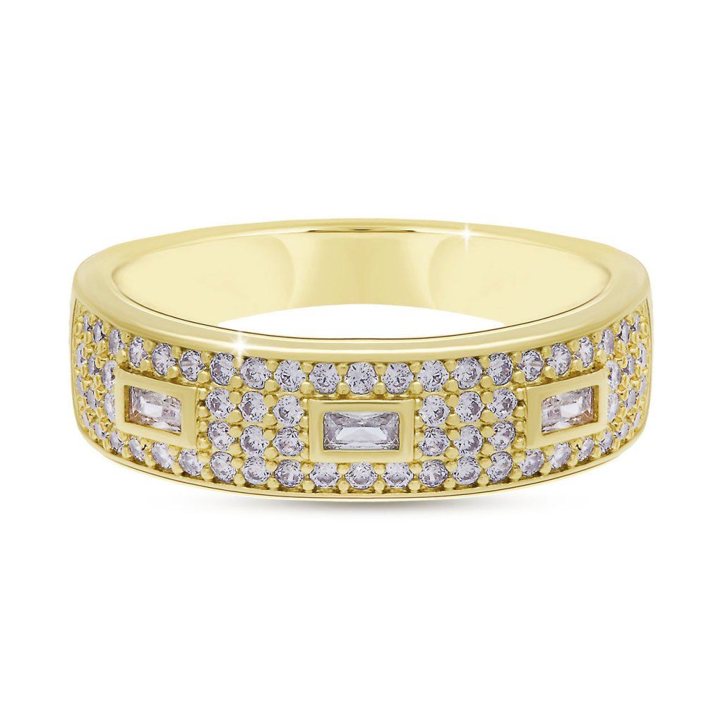 Inel luxos și de efect, cu o bază lucioasă placată și zirconii bogat încrustate, te va fermeca la prima vedere. Elementul dominant sunt zirconiile dreptunghiulare alungite, rafinat încastrate într-un motiv geometric și încadrate de mici zirconii rotunde. Bijuteria are un aspect elegant, dar totuși distinct – ideală pentru ocazii festive și pentru strălucire zilnică.