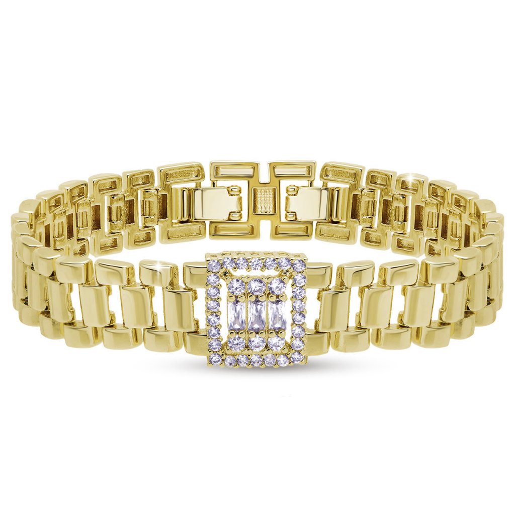 Această brățară elegantă și distinctivă, în stilul curelelor de ceas de lux, este o adevărată declarație de bijuterie. Construcția masivă cu zale, într-o nuanță lucioasă placată cu aur de 14K, este completată de un ornament central dreptunghiular, împodobit cu două rânduri de pietre clare. Combinația de eleganță modernă și strălucire radiantă creează un accesoriu de efect pentru ocazii festive și un look de zi cu zi distinctiv.