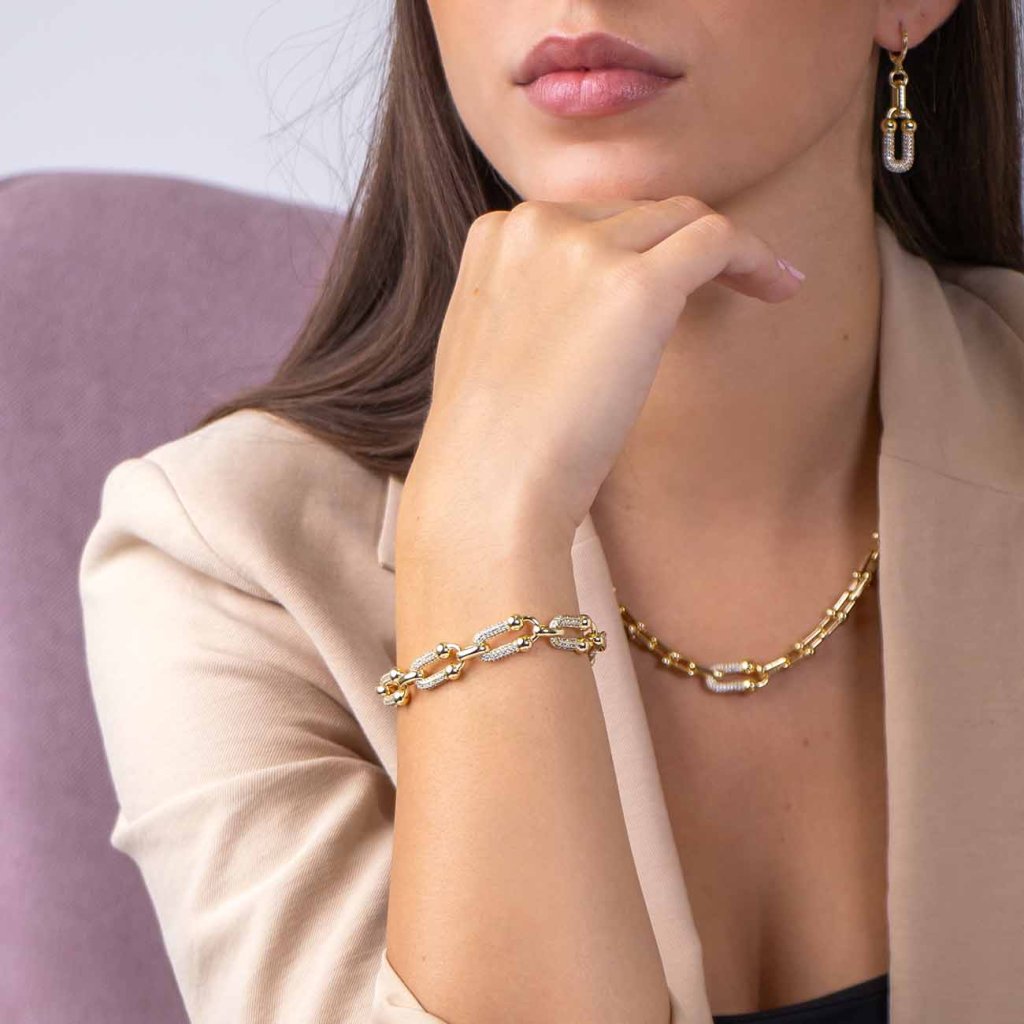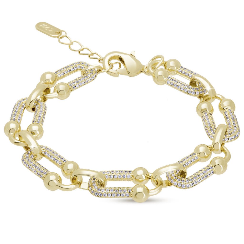 Remarcabil și elegant în același timp – aceasta este brățara de design cu o combinație de elemente netede și de zirconiu. Suprafața placată cu aur conferă bijuteriei o strălucire luxoasă, în timp ce finisajul detaliat o face un accesoriu de nelipsit pentru momente speciale și eleganța de zi cu zi. Ideal pentru femeile care iubesc bijuteriile cu caracter.