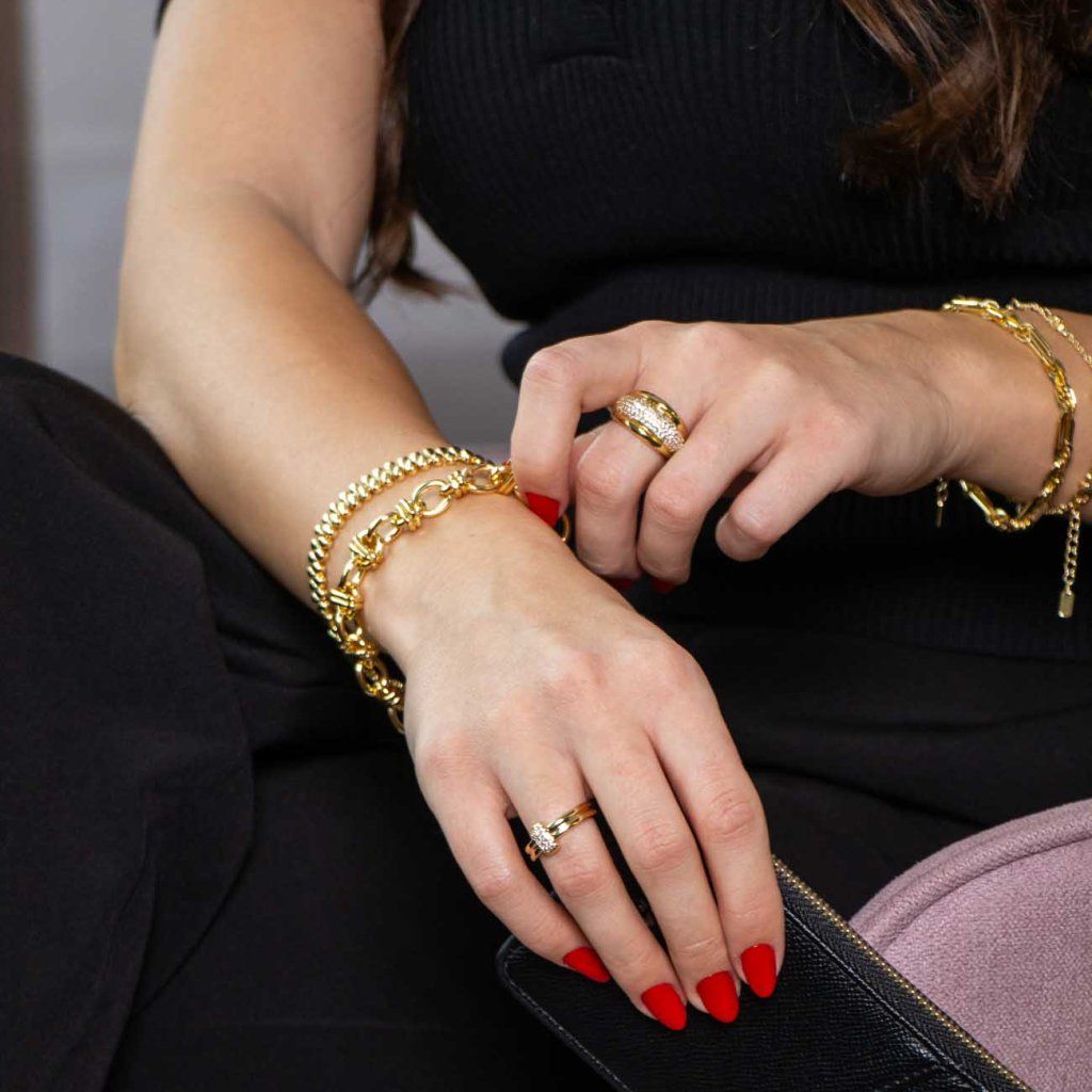 O brățară stilată cu elemente nod dominante emană încredere și eleganță în același timp. Liniile netede și masive creează o bijuterie statement care va deveni un accesoriu de neignorat pentru orice ținută. Placarea cu aur de 14K conferă brățării un aspect sofisticat și subliniază caracterul său atemporal. Datorită lanțului de prelungire, se adaptează confortabil încheieturii și este ideală pentru a fi purtată zilnic sau la ocazii speciale.