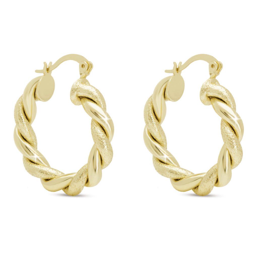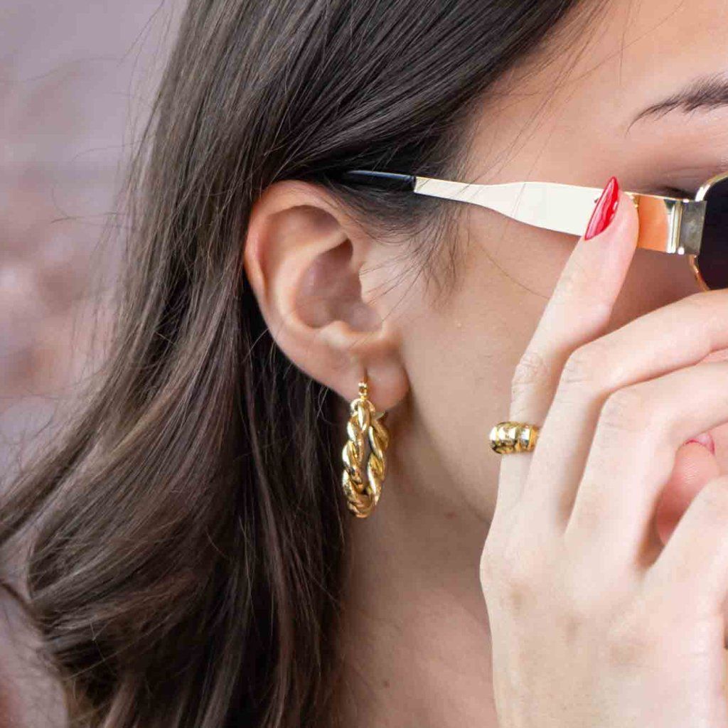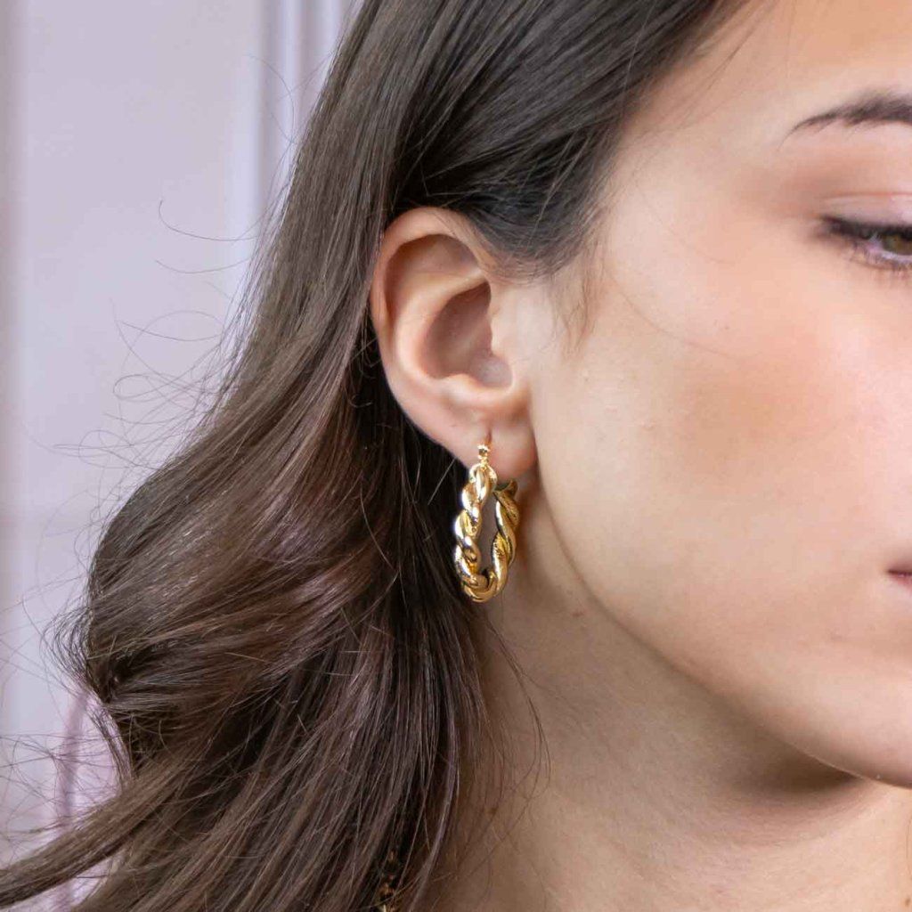 Cercei statement în design circular cu o suprafață răsucită elaborată combină texturi lucioase și mate care reflectă frumos lumina. Designul elegant va adăuga un plus de stil oricărei ținute – de la ținutele de zi cu zi la ocaziile de seară.
