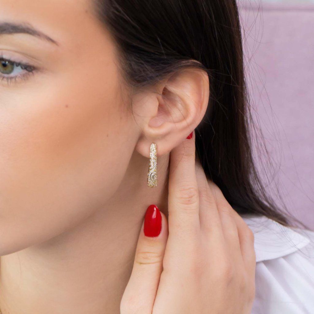 Cercei eleganți și rafinați cu un model ornamental delicat, strălucind datorită încrustației dense cu zirconii transparente. Forma lor curbată va îmbrățișa frumos lobul urechii și va adăuga o notă de lux aspectului tău. Sistemul confortabil de închidere cu clapetă (brevet rusesc) asigură o purtare sigură și ușoară.