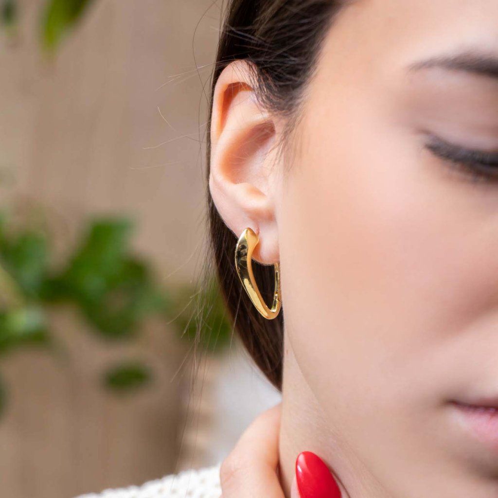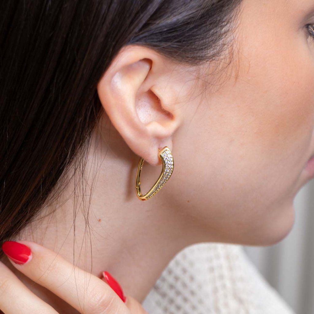 Cercei deosebiți, dar totuși fin rotunjiți, cu o curbă originală care urmărește frumos linia urechii. Partea frontală este decorată cu două șiruri de mici zirconii transparente, care conferă cerceilor o strălucire delicată și un aspect luxos. Un accesoriu stilat pentru purtarea zilnică sau de seară.
