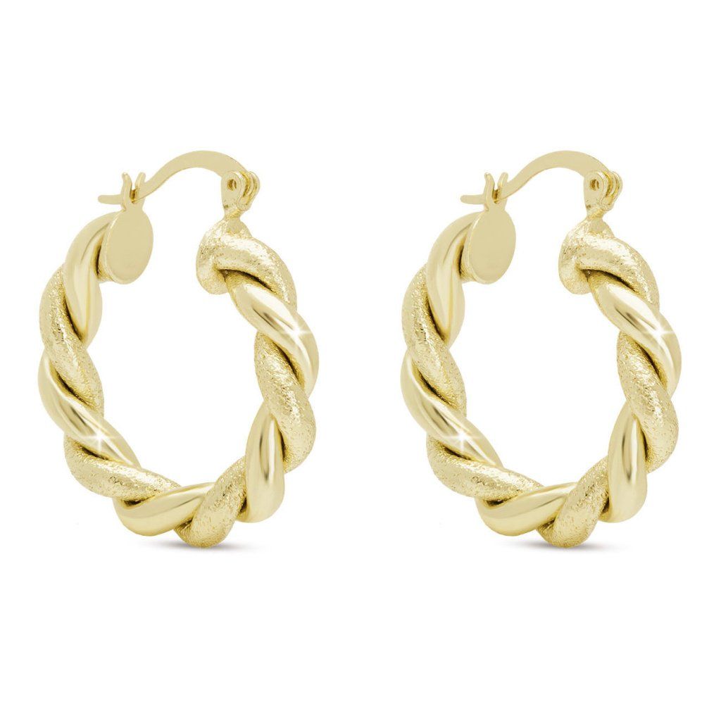 Cercei rotunzi distinctivi placati cu aur, cu design răsucit din metal rodiat, sistem de închidere franțuzesc, stil atemporal și strălucitor.