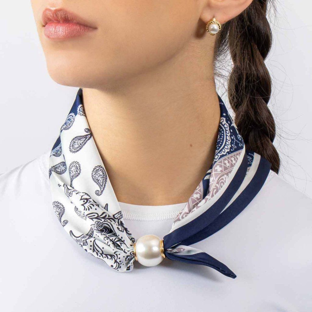 Această eșarfă fină din mătase, într-o elegantă combinație de albastru și alb, va atrage prin modelul paisley atemporal și prin manopera precisă. Strălucirea radiantă a materialului conferă un aspect luxos, în timp ce detaliul distinctiv al cataramei cu perle pare foarte sofisticat. Datorită închiderii practice, o poți ajusta cu ușurință exact după stilul tău.