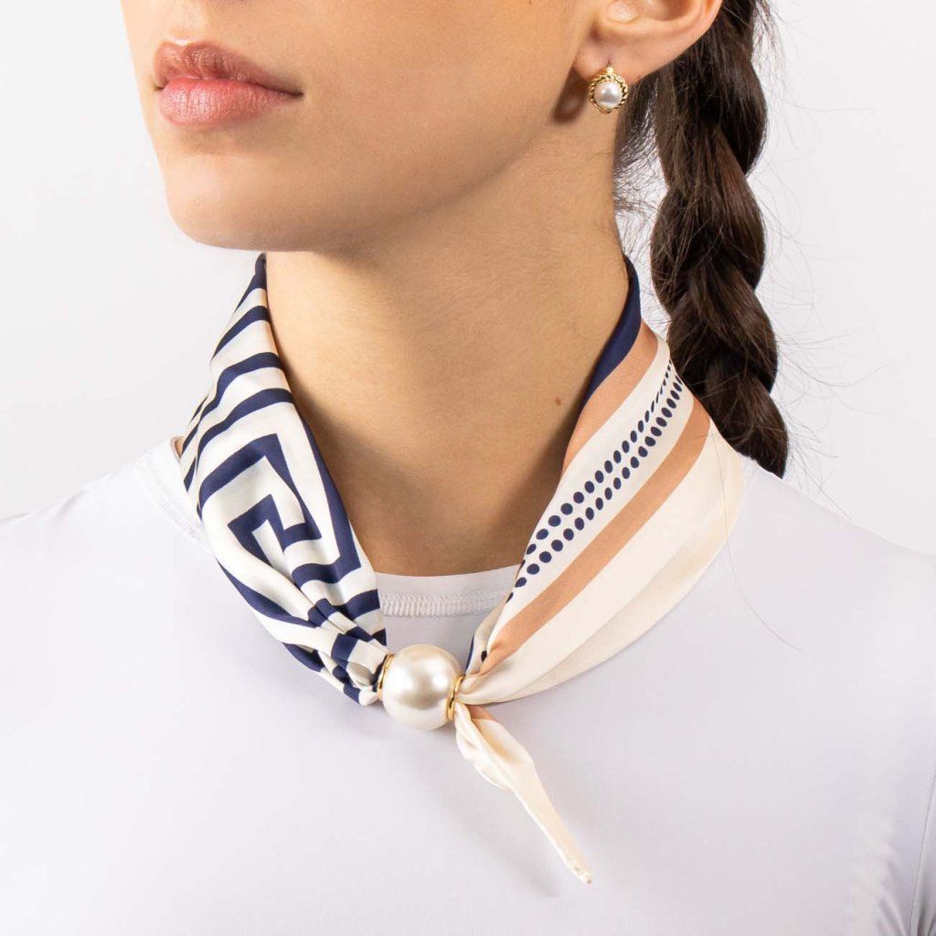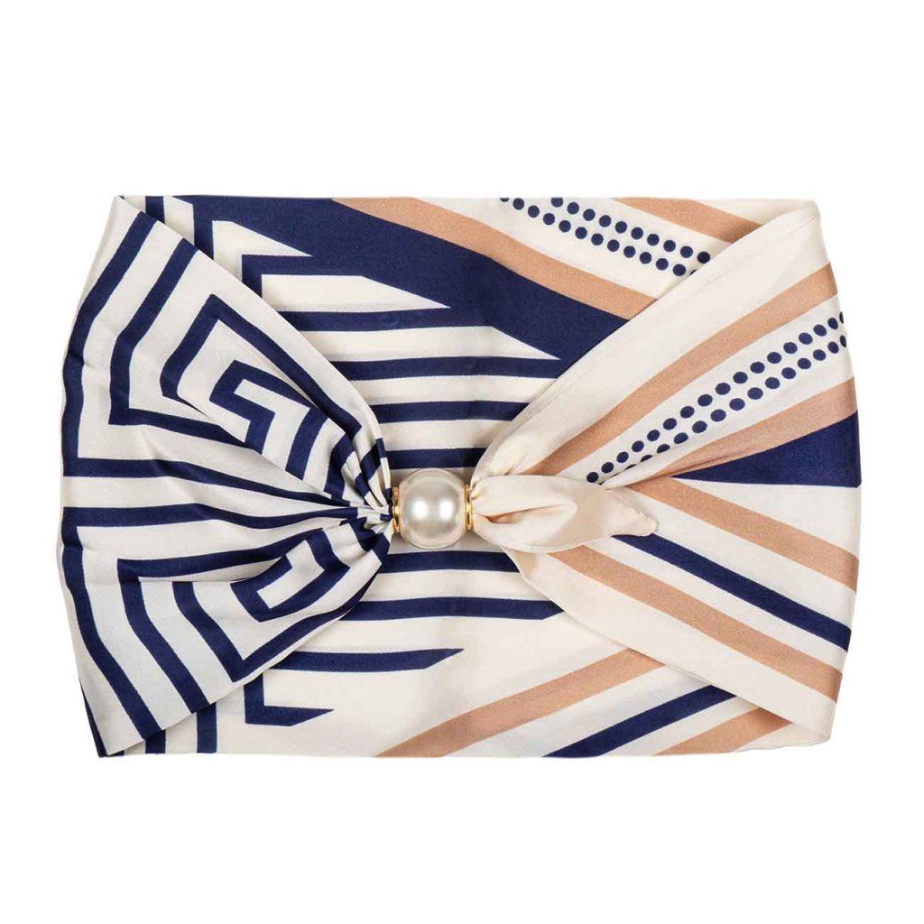 Această eșarfă strălucitoare din mătase combină linii geometrice precise cu o armonie delicată a culorilor. Combinația de albastru închis, crem și o nuanță caldă de bej pare elegantă și, în același timp, distinctă. Datorită cataramei magnetice cu perle, eșarfa capătă un detaliu sofisticat care va completa orice ținută.