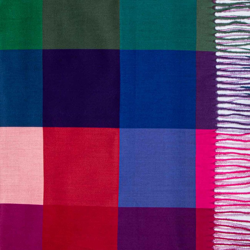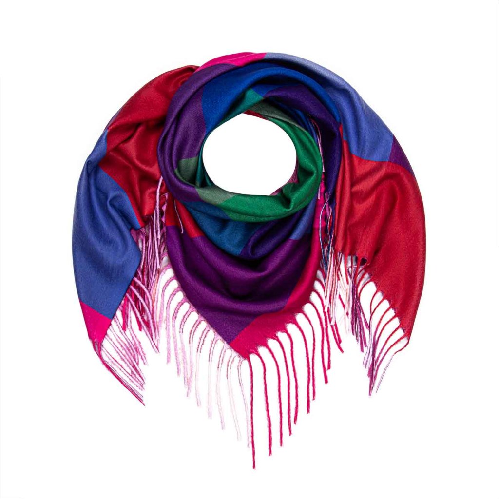 Eșarfă elegantă într-o combinație bogată de vișiniu, roz, albastru și verde. Ideală pentru femeile care nu se tem de culori. Materialul moale, fin și călduros, cu cașmir, oferă o senzație de lux la purtare.