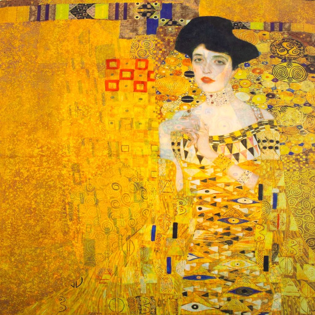 Pe o parte, eșarfa este decorată cu motivul celebru Portretul Adèlei Bloch-Bauer, iar pe cealaltă parte, cu imaginea iconică Sărutul. Datorită strălucirii delicate a mătăsii și a nuanțelor bogate de auriu, eșarfa arată excepțional și va adăuga ținutei tale o notă de lux artistic.