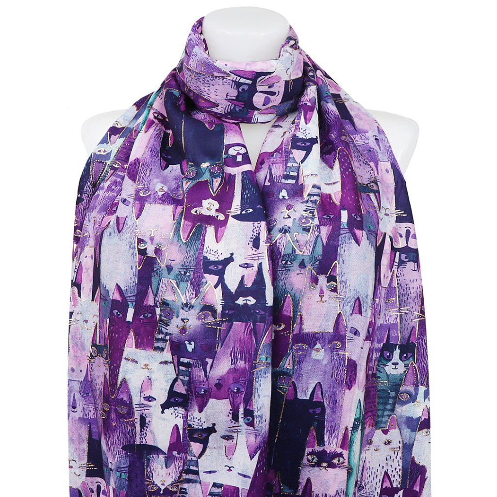 Esarfa dreptunghiulara calda de dama 3015-35 pisici abstracte cu fir auriu, culoare violet 7200672-4