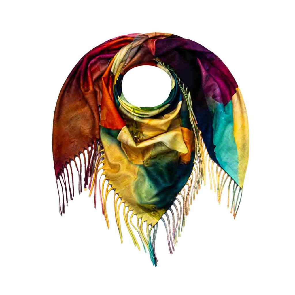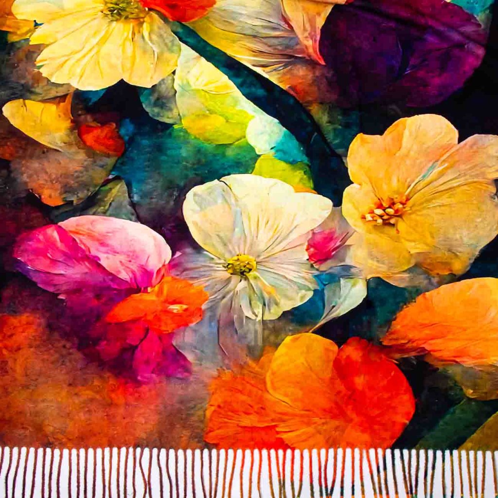 O eșarfă pătrată de lux, cu un model floral distinctiv într-o paletă vibrantă de culori, va aduce o notă proaspătă și originală ținutei tale. Combinația de tonuri strălucitoare de galben, portocaliu, roz, verde, albastru și violet are un aspect viu și optimist. Materialul fin este plăcut la atingere, călduros și, în același timp, ușor, astfel încât îl vei aprecia pe tot parcursul anului. Tivul este finisat cu franjuri decorative, care adaugă o notă elegantă eșarfei.