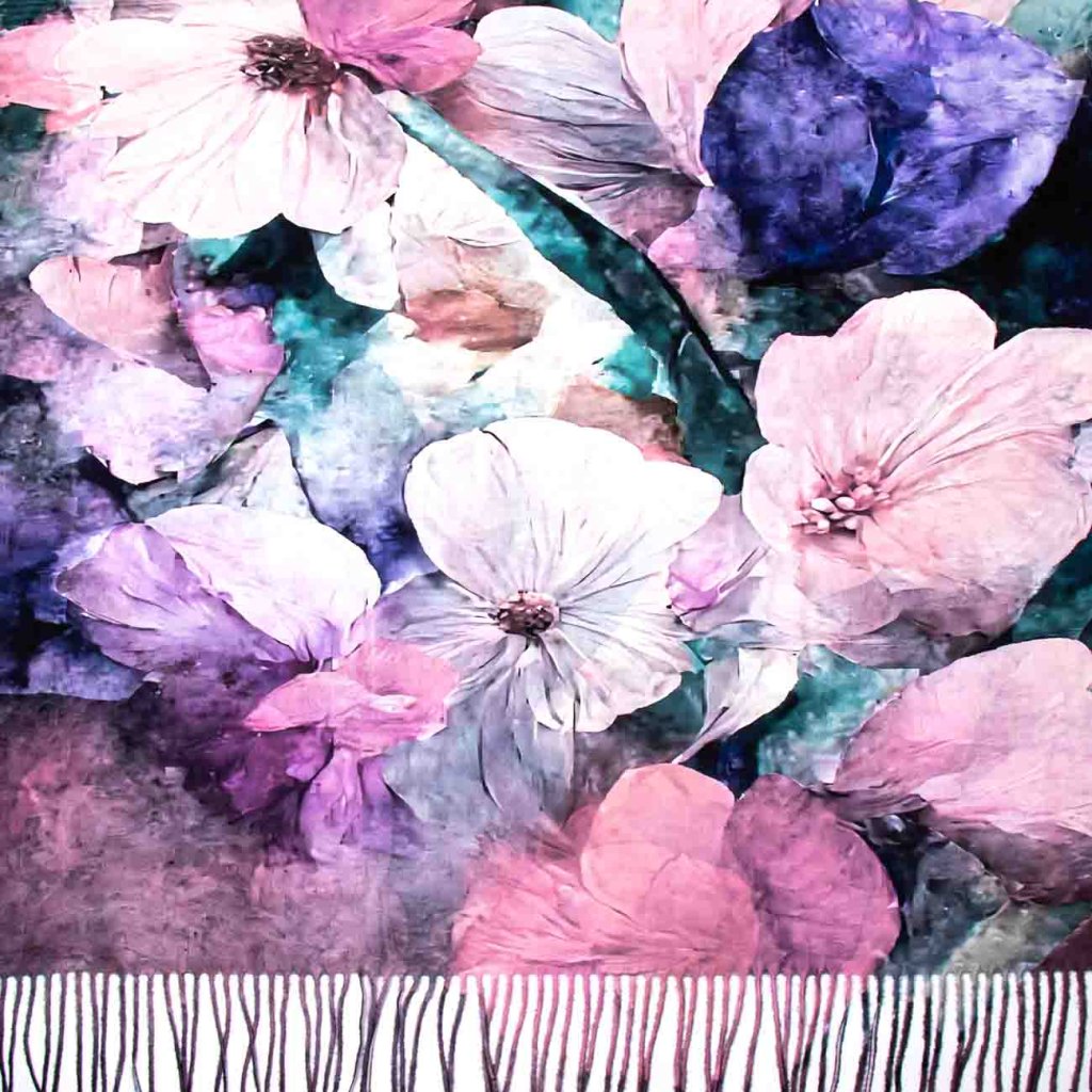 O eșarfă pătrată elegantă, care atrage atenția de la prima vedere prin modelul său floral delicat în nuanțe de roz, violet și alb, completată de un fundal contrastant mai închis. Materialul fin cu adaos de cașmir este moale la atingere și călduros, ceea ce îl face un accesoriu ideal pentru zilele mai reci. Datorită franjurilor bogate, are un aspect aerisit și adaugă o notă de lux ținutei. Poate fi purtat în multe feluri – în jurul gâtului, pe umeri sau legat ca un șal.