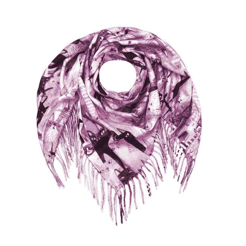 Eșarfa originală, pătrată, cu un model jucăuș de pisici în nuanțe de violet, va adăuga o notă de veselie și stil personal ținutei tale. Motivul distinctiv al pisicilor oferă un aspect vesel, dar și elegant. Datorită combinației de viscoză și cașmir, eșarfa este fină, plăcută la atingere și călduroasă, fiind potrivită atât pentru ținutele de zi cu zi, cât și pentru ocazii speciale. Franjurii decorativi de pe margine oferă eșarfei un șarm modern.