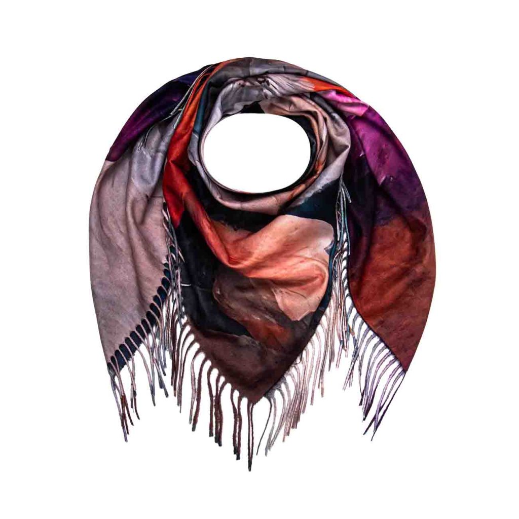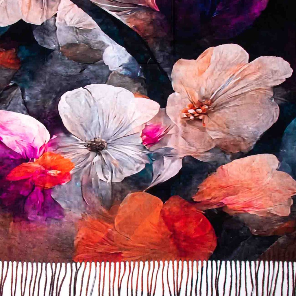 Această eșarfă este o combinație de eleganță și stil romantic delicat. Motivul floral în nuanțe de alb, crem, portocaliu, roz și violet arată foarte sofisticat, în timp ce fundalul întunecat adaugă profunzime designului și o notă de lux. Datorită materialului fin, eșarfa este plăcută la atingere și se adaptează ușor diferitelor stiluri de purtare – o poți lega în jurul gâtului, peste umeri sau o poți folosi ca accesoriu elegant pentru rochiile de seară.