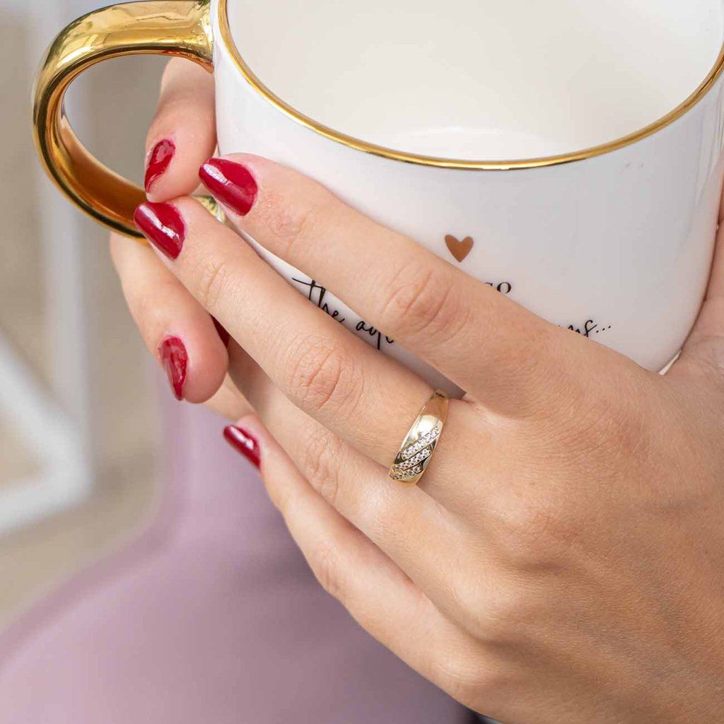Un inel simplu, dar foarte elegant, care încântă prin ornamentația sa decentă. Trei linii oblice, împânzite cu zirconii mici, creează o strălucire fină pe suprafața netedă placată cu aur. Designul minimalist îl face un accesoriu ideal pentru purtarea de zi cu zi și pentru ocazii festive.
