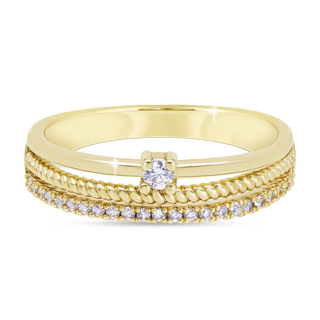 Un inel elegant, cu o structură fin decorată, combină mai multe elemente de design într-un ansamblu armonios. Zirconiul central transparent dominant este fixat elegant cu patru gheruțe și mărginit de un decor fin răsucit. Partea inferioară este decorată cu o serie de zirconii mici, care adaugă o strălucire delicată inelului. Finisajul din aur de 14 karate subliniază caracterul său luxos.