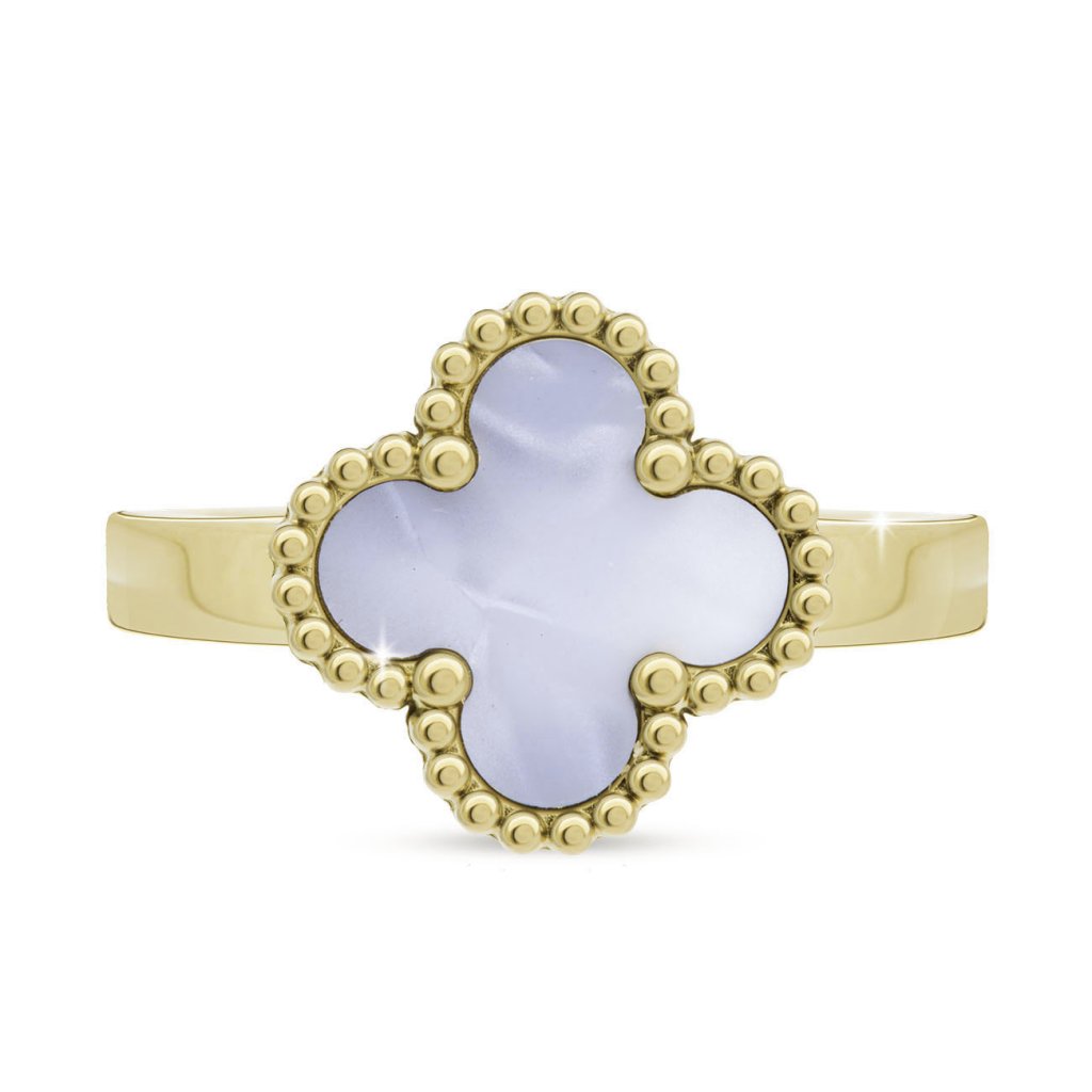 Un inel elegant, fabricat din oțel chirurgical de înaltă calitate, cu placat cu aur de 14 karate. Elementul dominant este un motiv de trifoi cu patru foi cu un centru sidefat deschis, care adaugă o notă delicată și sofisticată bijuteriei. Circumferința elementului decorativ este împodobită cu caneluri fine, care conferă bijuteriei un caracter unic.