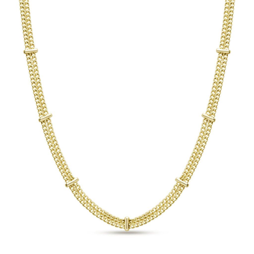 Acest lanț radiant impresionează prin designul său dublu original, care iese în evidență, menținând în același timp o eleganță subtilă. Conectarea precisă a două lanțuri creează un accesoriu atemporal care va adăuga o notă sofisticată stilului tău.