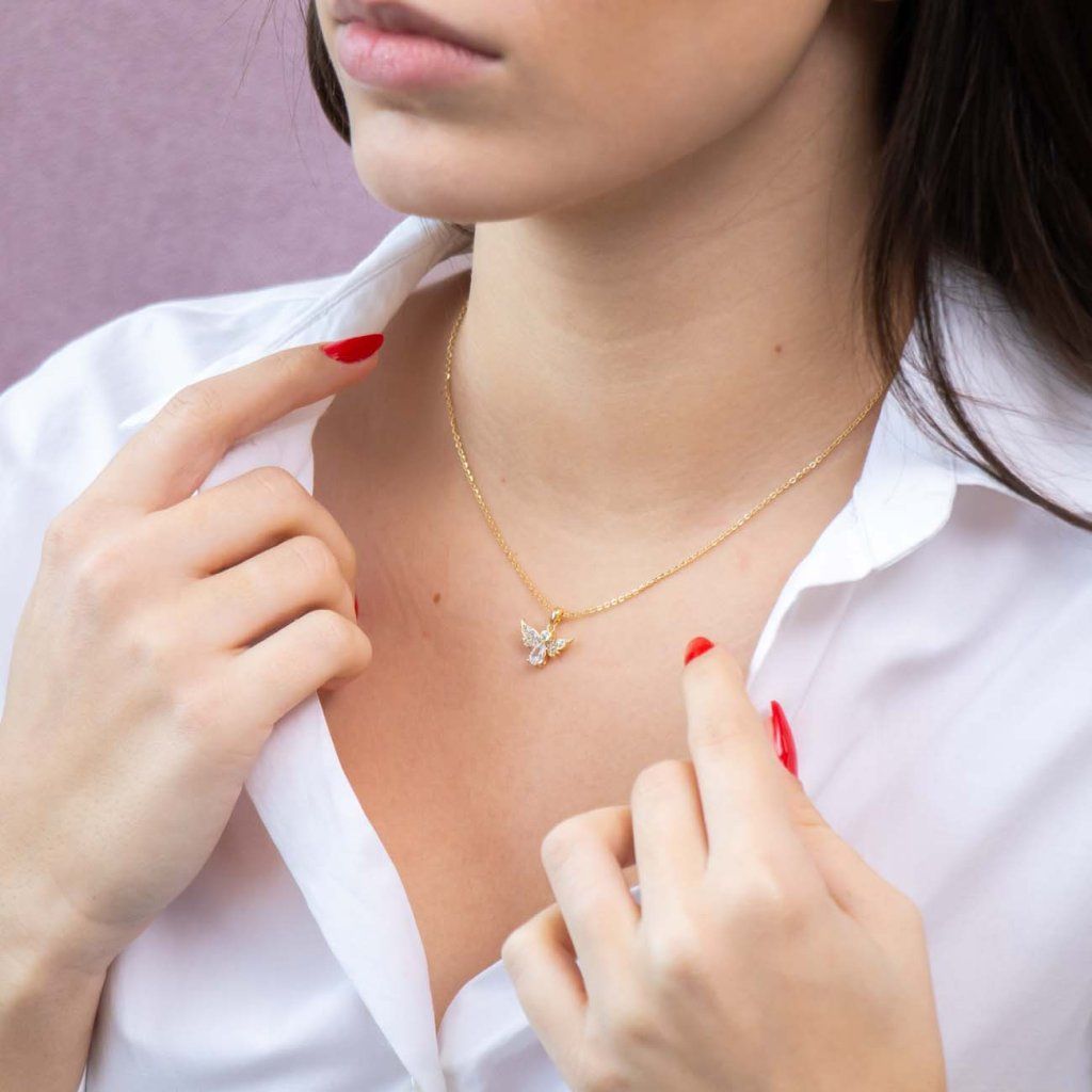 Un lanț elegant cu pandantiv înger este un simbol delicat de protecție și lumină. Zirconiile strălucitoare accentuează aripile și corpul îngerului, creând o impresie de frumusețe fragilă cu un sens profund. Ideal ca un cadou pentru cineva drag sau ca un talisman pentru a fi purtat zilnic.